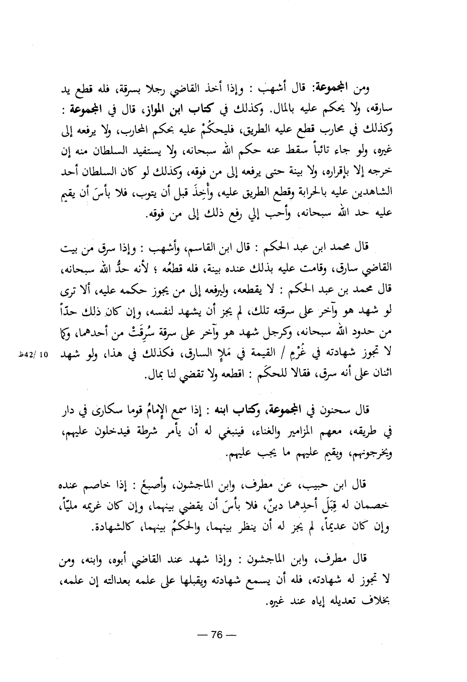 ومن المجموعة: قال أشهب: وإذا أخذ القاضي رجلا بسرقة، فله قطع يد سارقه، ولا يحكم عليه بالمال. وكذلك في كتاب ابن المواز، قال في المجموعة: وكذلك في محارب قطع عليه الطريق، فليحكم عليه بحكم المحارب، ولا يرفعه إلى غيره، ولو جاء تائبا سقط عنه حكم الله سبحانه، ولا يستفيد السلطان منه إن خرجه إلا بإقراره، ولا بينة حتى يرفعه إلى فوقه، وكذلك لو كان السلطان أحد الشاهدين عليه بالحرابة وقطع الطريق عليه، وأخذ قبل أن يتوب، فلا بأس أن يقيم عليه حد الله سبحانه، وأحب إلي رفع ذلك إلى من فوقه.