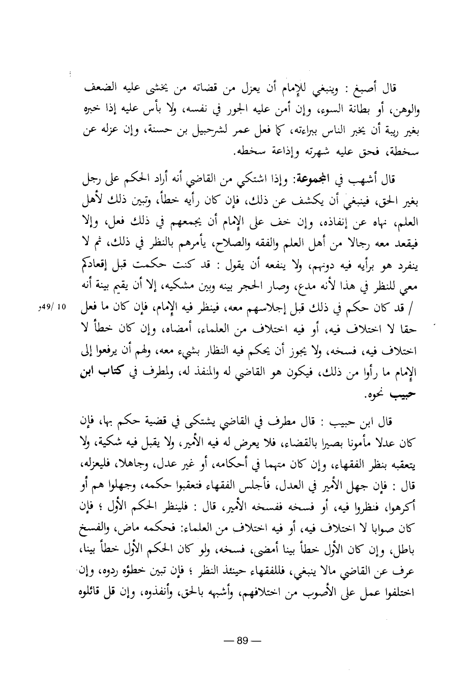 قال ابن حبيب: قال مطرف في القاضي يشتكي في قضية حكم بها، فإن كان عدلا مأمونا بصيرا بالقضاء، فلا يعرض له فيه الأمير، ولا يقبل فيه شكية، ولا يتعقبه بنظرالفقهاء، وإن كان متهما في أحكامه، أو غير عدل، وجاهلا، فليعزله، قال: فإن جهل الأمير في العدل، فأجلس الفقهاء فتعقبوا حكمه، وجهلوا هم أو أكرهوا، فنظروا فيه، أو فسخه ففسخه الأمير، قال: فلينظر الحكم الأول؛ فإن كان صوابا لا اختلاف فيه، أو فيه اختلاف من العلماء: فحكمه ماض، والفسخ باطل، وإن كان الأول خطأ بينا أمضى، فسخه، ولو كان الحكم الأول خطأ بينا، عرف عن القاضي مالا ينبغي، فللفقهاء حينئذ النظر؛ فإن تبين خطؤه ردوه، وإن اختلفوا عمل على الأصوب من اختلافهم، وأشبه بالحق، وأنقذوه، وإن قل قائلوه [8/ 89]