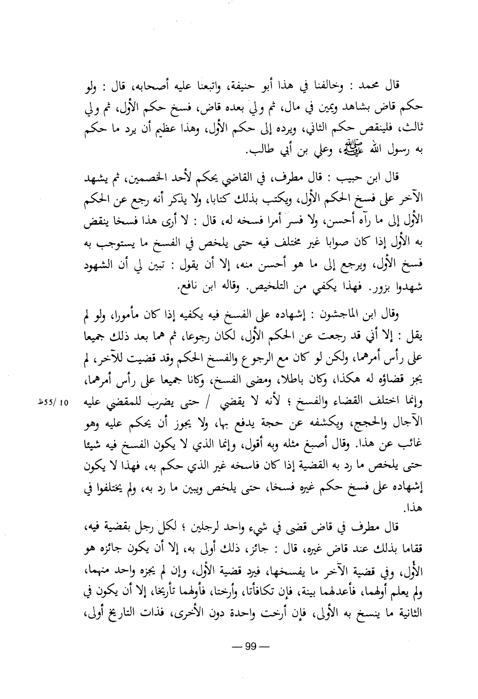 وقال ابن الماجشون: إشهاده على الفسخ فيه يكفيه إذا كان مأمورا، ولو لم يقل: إلا أني قد رجعت عن الحكم الأول، لكان رجوعا، ثم هما بعد ذلك جميعا على رأس أمرهما، ولكن لو كان مع الرجوع والفسخ الحكم وقد قضيت للآخر، لم يجز قضاؤه له هكذا، وكان باطلا، ومضى الفسخ، وكانا جميعا على رأس أمرهما، وإنما اختلف القضاء والفسخ؛ لأنه لا يقضي/ حتى يضرب للمقضي عليه الآجال والحجج، ويكشفه عن حجة يدفع بها، ولا يجوز أن يحكم وهو غائب عن هذا. وقال أصبغ مثله وبه أقول، وإنما الذي لا يكون الفسخ فيه شيئا حتى يلخص ما رد به القضية إذا كان فاسخه غير الذي حكم به، فهذا لا يكون إشهاده على فسخ حكم غيره فسخا، حتى يلخص ويبين ما رد به، ولم يختلفوا في هذا.
