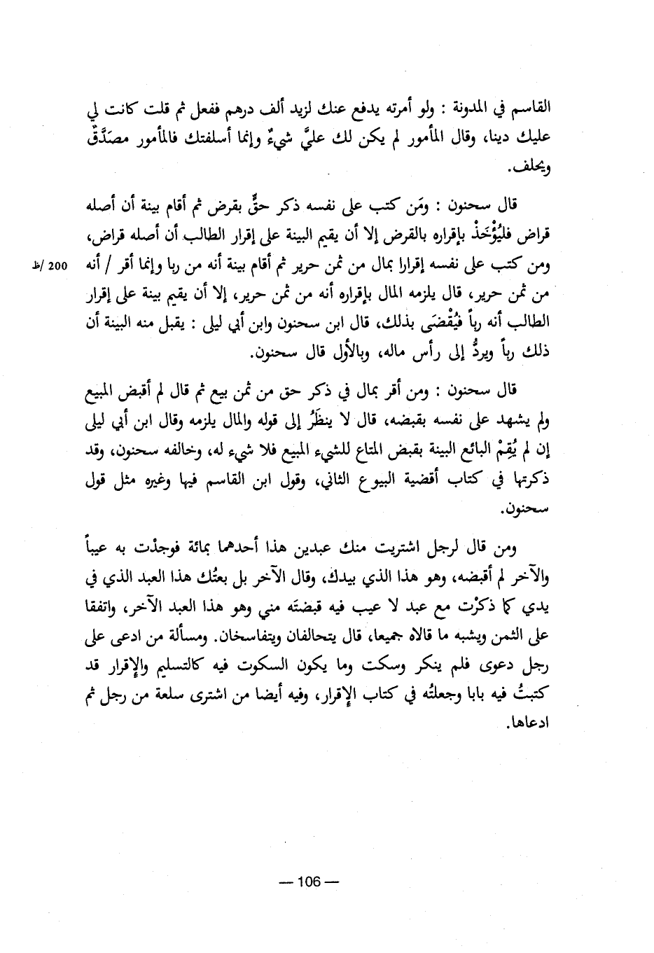 ومن قال لرجل اشتريت منك عبدين هذا أحدهما بمائة فوجدت به عيباً والآخر لم أقبضه، وهو هذا الذي بيدك، وقال الآخر بل بعتك هذا العبد الذي في يدي كما ذكرت مع عبد لا عيب فيه قبضته مني وهو هذا العبد الآخر، واتفقا علي الثمن ويشبه ما قالاه جميعا، قال يتحالفان ويتفاسخان. ومسألة من ادعي علي رجل دعوي فلم ينكر وسكت وما يكون السكوت فيه كالتسليم والإقرار قد كتبت فيه بابا وجعلته في كتاب الإقرار، وفيه أيضا من اشتري سلعة من رجل ثم ادعاها.