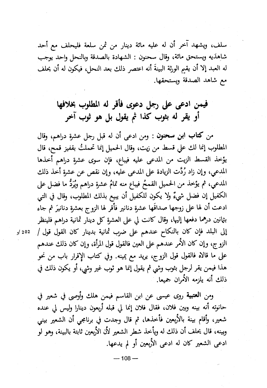 من كتاب ابن سحنون: ومن ادعي أن له قبل رجل عشرة دراهم، وقال المطلوب إنما لك علي قسط من زيت، وقال الحميل إنما تحملت بقفيز قمح، قال يؤخذ القسط الزيت من المدعي عليه فيباع، فإن سوي عشرة دراهم أخذها المدعي، ثم يؤخذ من الحميل القمح فيباع منه تمام عشرة دراهم ويرد ما فضل علي الكفيل إن فضل شئ ولا يكون للكفيل أن يبيع بذلك المطلوب، وقال في التي ادعت أن لها علي زوجها صداقها عشرة دنانير فأقر لها الزوج بعشرة دنانير ثم جاء بثمانين درهما دفعها إليها، وقال كانت لي علي العشرة كل دينار ثمانية بدينار كان القول قول / الزوج، وإن كان الأمر عندهم علي العين فالقول قول المرأة، وإن كان ذلك عندهم علي ما قالاه فالقول قول الزوج، يريد مع يمينه. وفي كتاب الإقرار باب من نحو هذا فيمن يقر لرجل بثوب وشي ثم يقول إنما هو ثوب غير وشي، أو يكون ذلك في ذلك أنه يلزمه الأمران جميعا.