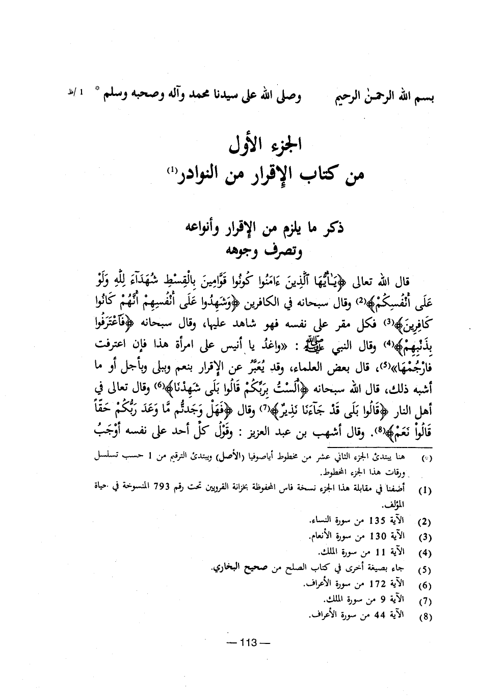 (¬1) أضفنا في مقابلة هذا الجزء نسخة فاس المحفوطة بخزانة القرويين تحت رقم 793 المنسوخة في حياة المؤلف.