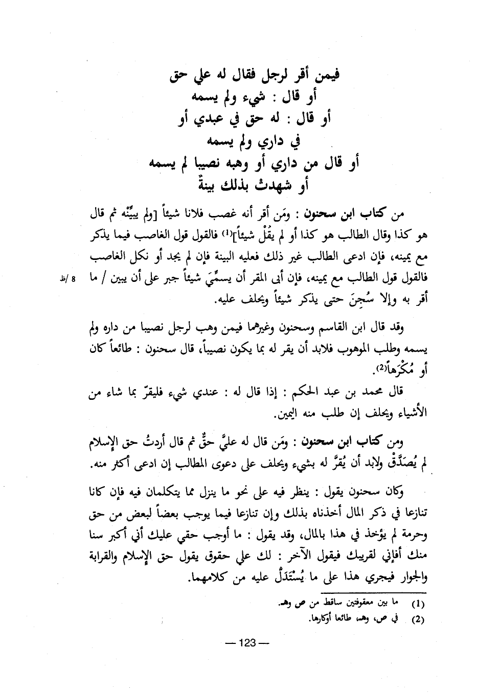 ومن كتاب ابن سحنون: ومن قال له علي حق ثم أردت حق الإسلام لم يصدق ولابد أن يقر له بشئ ويحلف علي دعوي المطالب إن ادعي أكثر منه.