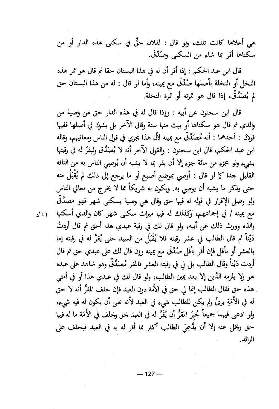 قال ابن سحنون عن أبيه: وإذا قال له في هذه الدار حق من وصية من والدي ثم قال هو سكناها أو بيت منها سنة وقال الآخر بل بشرك في أصلها ففيها قولان: أحدهما: أنه مصدق مع يمينه لأن هذا يجري في قول الناس ومعانيهم، وقاله ابن عبد الحكم، قال ابن سحنون: والقول الآخر أنه لا يصدق وليقر له في رقبتها بشئ ولو بجزء من مائة جزء إلا أن يقر بما لا يشبه أن يوصي الناس به من التافه القليل جدا كما لو قال: أوصي بموضع أصبع أو ما يرجع إلي ذلك لم يقبل منه حتي يذكر ما يشبه أن يوصي به. ويكون به شريكاً مما لا يخرج من معاني الناس ولو وصل الإقرار في قوله له فيها حق وقال هي وصية بسكني شهر فهو مصدق مع يمينه / في إجماعهم، وكذلك له فيها ميراث سكني شهر كان والدي أسكنها والده وورث ذلك عن أبيه، ولو قال لك في رقبة عبدي هذا أحق ثم قال أردت دينا ثم قال الطالب لي عشر رقبته فلا يقبل من السيد حتي يقر له في رقبته إنا بالعشر أو بأقل فإن أقر بأقل صدق مع يمينه وإن قال لك علي عبدي حق ثم قال أردت دينا ثم قال الطالب لي عشر رقبته فلا يقبل من السيد حتي يقر له في رقبته إما بالعشر أو بأقل فإن أقر بأقل صدق مع يمينه وإن قال لك علي عبدي حق ثم قال أردت ديناً وقال الطالب بل لي في رقبته العشر فالمقر مصدق وهو شاهد علي عبده هو ولا يلزمه الدين إلا بعد يمين الطالب، ولو قال لك في عبدي هذا أو في امتي هذه حق فقال الطالب إنما لي حق في الأمة دون العبد فإن حلف المقر أنه لا حق له في الأمة برئ ولم يكن للطالب شئ في العبد لأنه نفي أن يكون له فيه شئ، ولو ادعي فيهما جميعاً جبر المقر أن يقر له في العبد بحق ويحلف في الأمة ما له فيها حق ويخلي عنه إلا أن يدعي الطالب أكثر مما أقر له به في العبد فيحلف علي الزائد.
