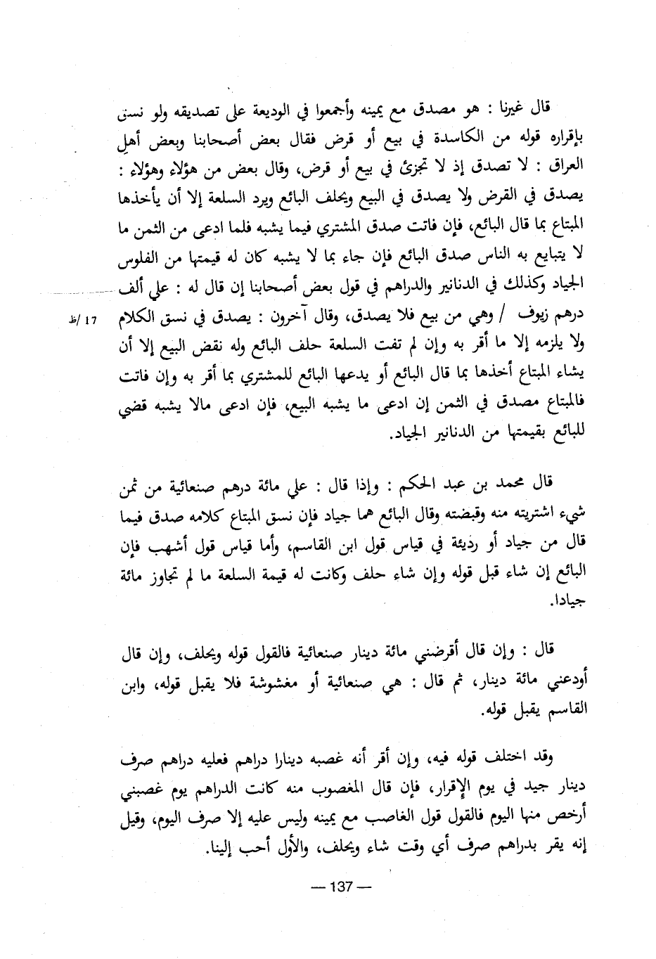 قال محمد بن عبد الحكم: وإذا قال: علي مائة درهم صنائعية من ثمن شئ اشتريته منه وقبضته وقال البائع هما جياد فإن نسق المبتاع كلامه صدق فيما قال من جياد أو رديئة في قياس قول ابن القاسم، وأما قياس قول أشهب فإن البائع إن شاء قبل قوله وإن شاء حلف وكانت له قيمة السلعة ما لم تجاوز مائة جيادا.