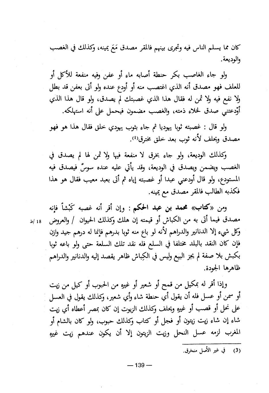 ومن"كتاب" محمد بن عبد الحكم: وإن أقر أنه غصبه كبشاً فإنه مصدق فيما أتي به من الكباش أو قيمته إن هلك وكذلك الحيوان / والعروض وكل شئ إلا الدنانير والدراهم لنه لو باع منه ثوبا بدرهم فإنما له درهم جيد وازن فإن كان النقد بالبلد مختلفا في السلع فله نقد تلك السلعة حتي ولو باعه ثوبا بكبش بلا صفة لم يجز البيع وليس في الكباش ظاهر يقصد إليه والدنانير والدراهم ظاهرها الجودة.