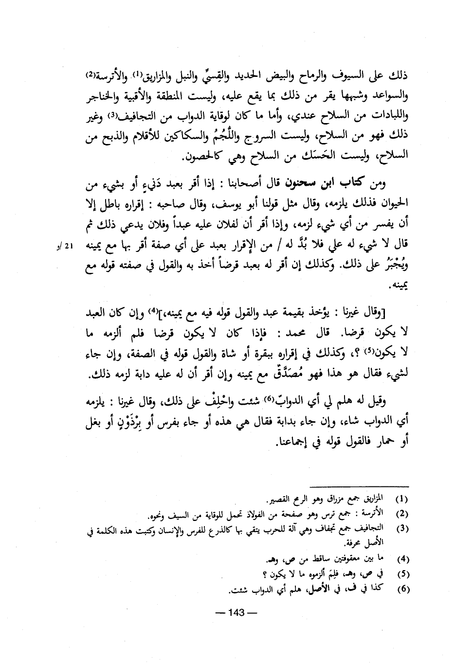 ذلك علي السيوف والرماح والبيض الحديد والقسي والنيل والمزاريق (¬1) والأترسة (¬2) والسواعد وشبهها يقر من ذلك بما يقع عليه، وليست المنطقة والأقبية والخناجر واللبادات من السلاح عندي، وأما ما كان لوقاية الدواب من التجافيف (¬3) وغير ذلك فهو من السلاح، وليست السروج واللجم والسكاكين للأقلام والذبح من السلاح، وليست الحسك من السلاح وهي كالحصون.