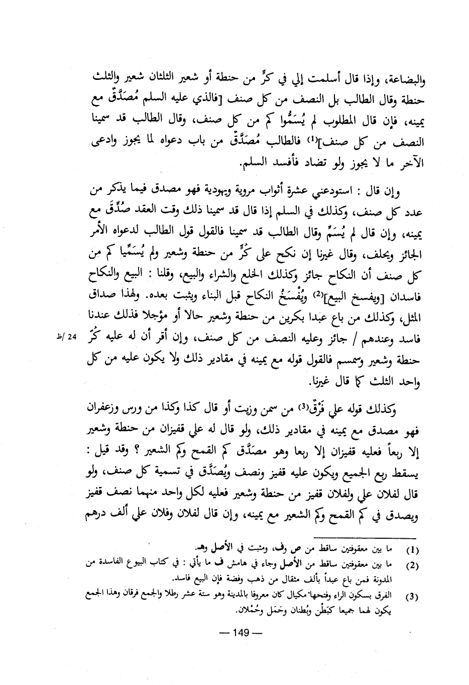 والبضاعة، وإذا قال أسلمت إلي في كر من حنطة أو شعير الثلثان شعير والثلث حنطة وقال الطالب بل النصف من كل صنف [فالذي عليه السلم مصدق مع يمينه، فإن قال المطلوب لم يسموا كم من كل صنف، وقال الطالب قد سمينا النصف من كل صنف (¬1) فالطالب مصدق من باب دعواه لما يجوز وادعي الآخر ما لا يجوز ولو تضاد فأفسد السلم.