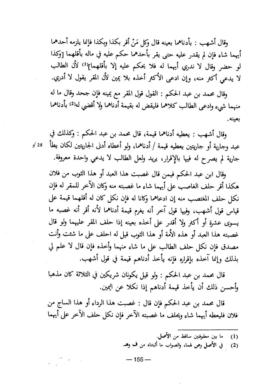 وقال ابن عبد الحكم فيمن قال غصبت هذا العبد أو هذا الثوب من فلان هكذا أقر حلف الغاصب علي أيهما شاء ما غصبته منه وكان الآخر للمقر له فإن نكل كان له أقلهما قيمة علي قياس قول أشهب، وفيها قول آخر أنه يغرم قيمة أدناهما لأنه أقر أنه غصبه ما يسوي عشرة أو أكثر ولا أقدر علي أخذه بعينه إذا حلف المقر عليهما ولو قال غصبته هذا العبد او هذه الأمة أو هذا الثوب قيل له احلف علي ما شئت وأنت مصدق فإن نكل حلف الطالب علي ما شاء منهما وأخذخ فإن قال لا علم لي بذلك وإنما آخذه بإقراره فإنه يأخذ أدناهم قيمة في قول أشهب.