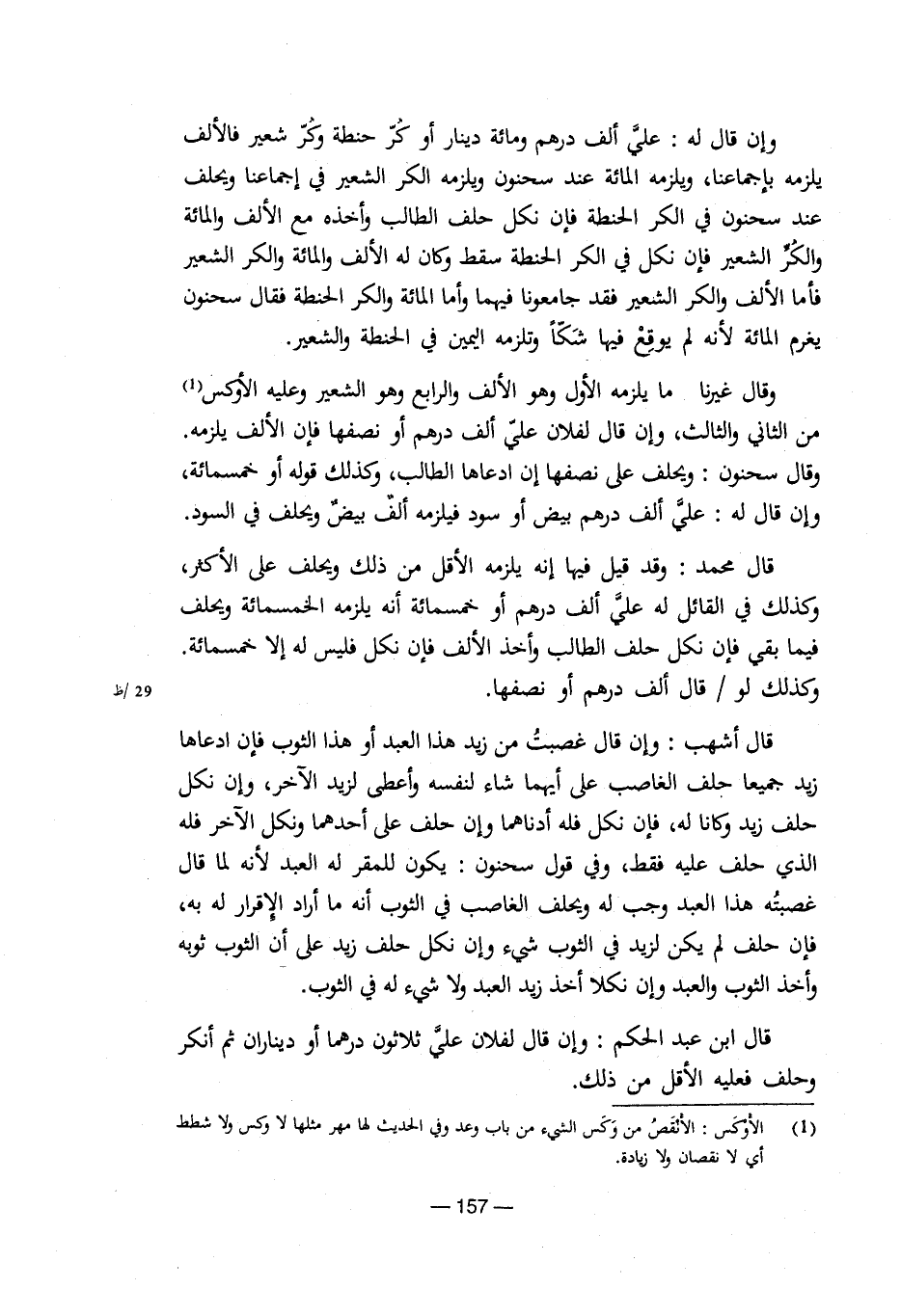 وإن قال له: علي ألف درهم ومائة دينار أو كر حنطة وكر شعير فألألف يلزمه بإجماعنا، ويلزمه المائة عند سحنون ويلزمه الكر الشعير في إجماعنا ويحلف عند سحنون في الكر الحنطة فإن نكل حلف الطالب وأخذه مع الألف والمائة والكر الشعير فأما الألف والكر الشعير فقد جامعونا فيهما وأنا المائة والكر الحنطة فقال سحنون يغرم المائة لأنه لم يوقع فيها شكا وتلزمه اليمين في الحنطة والشعير.