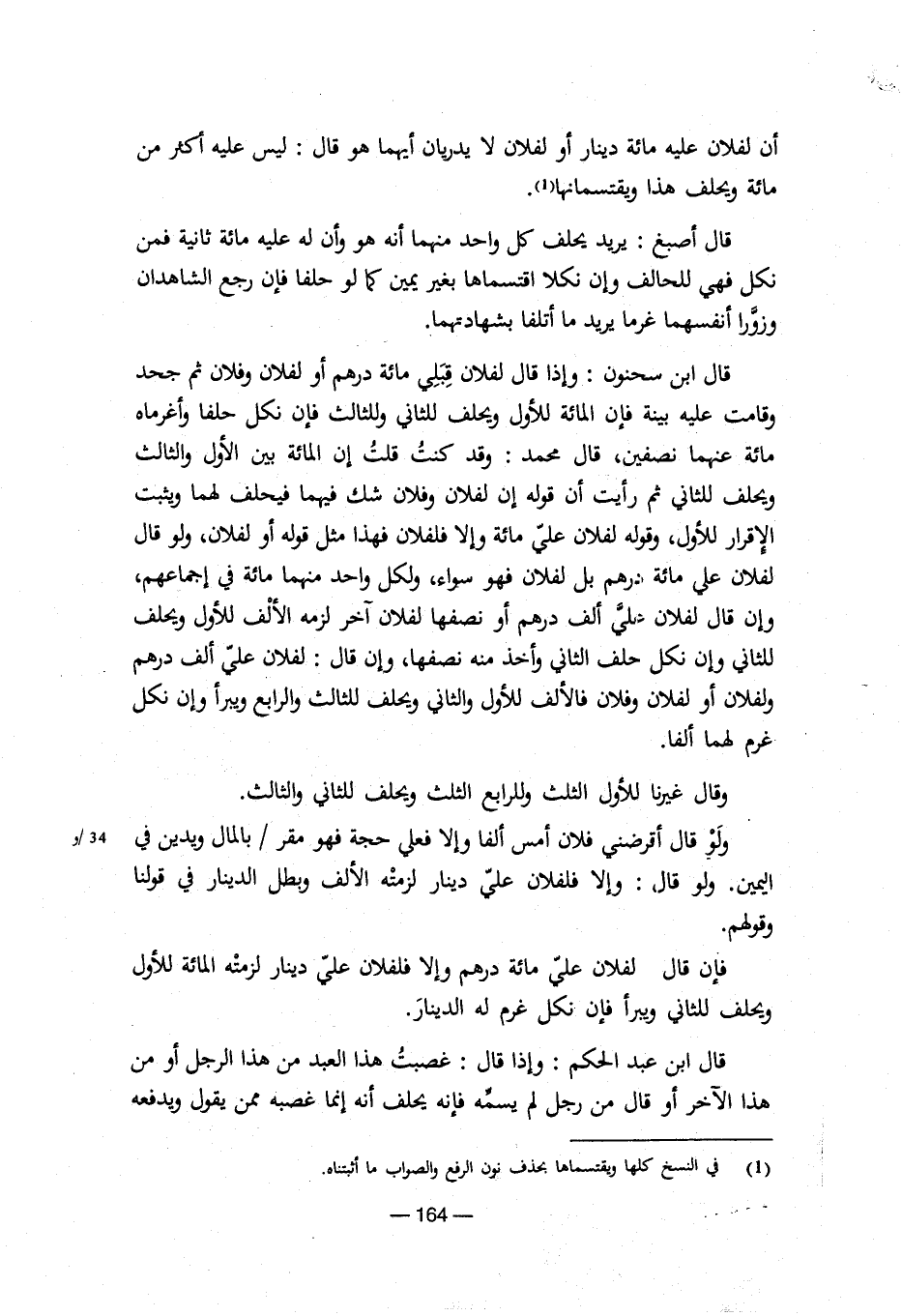 أن لفلان عليه مائة دينار أو لفلان لا يدريان أيهما هو قال: ليس عليه أكثر من مائة ويحلف هذا ويقتسمانها (¬1).