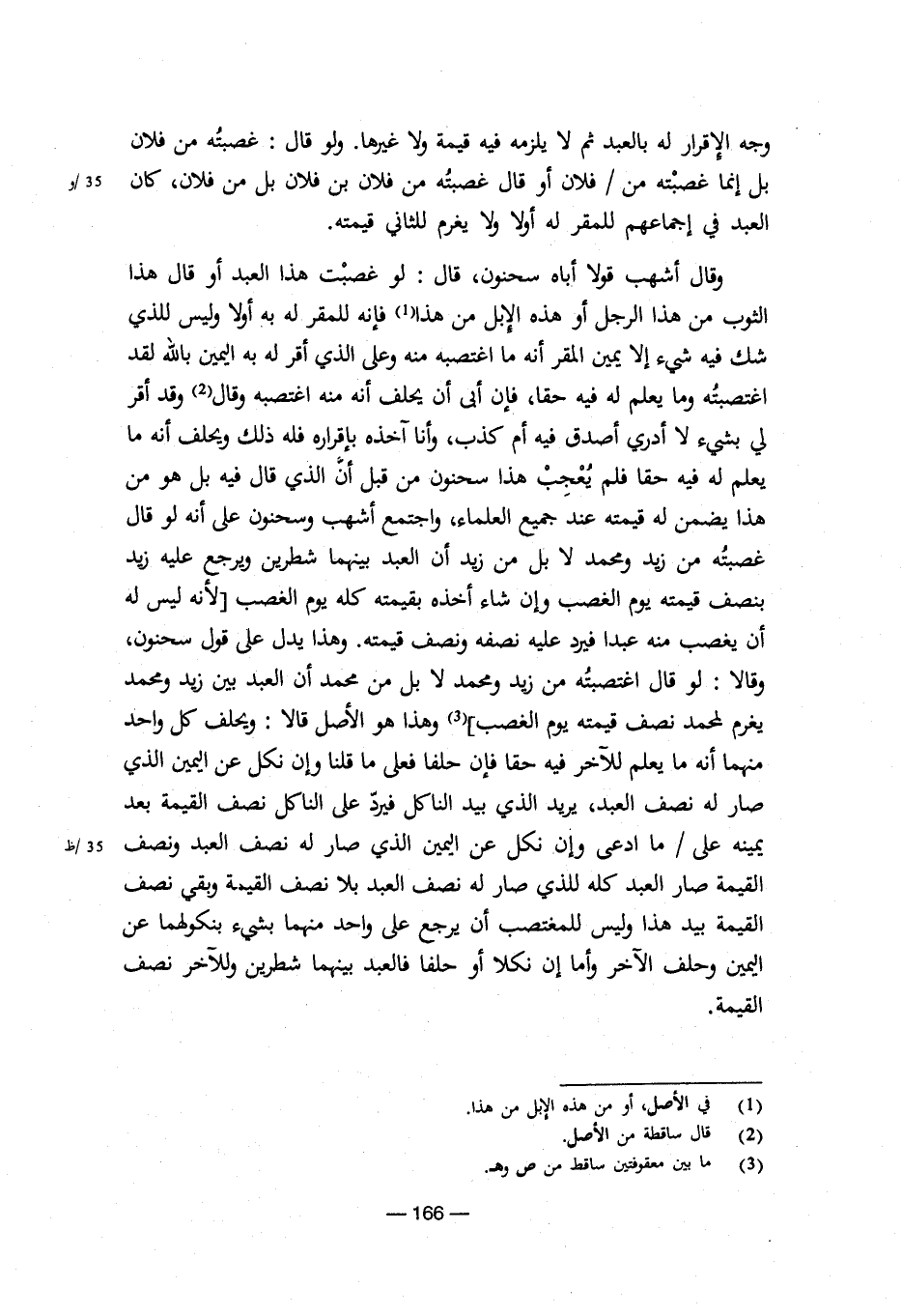 وقال أشهب قولا أباه سحنون، قال: لو غصبت هذا العبد أو قال هذا الثوب من هذ الرجل أو هذه الإبل من هذا (¬1) فإنه للمقر له به أولا وليس للذي شك فيه شئ إلا يمين المقر أنه ما اغتصبه منه وعلي الذي أقر له به اليمين بالله لقد اغتصبه وما يعلم له فيه حقا، فإن بي أن يحلف أنه منه اغتصبه وقال (¬2) وقد أقر لي بشئ لا أدري أصدق فيه أن كذب، وأنا آخذه بإقراره فله ذلك ويحلف أنه ما يعلم له فيه حقا فلم يعجب هذا سحنون من قبل أن الذي قال فيه بل هو من هذا يضمن له قيمته عند جميع العلماء, واجتمع أشهب وسحنون علي أنه لو قال غصبته من زيد ومحمد لا بل من زيد أن العبج بينهما شطرين ويرجع عليه زيد بنصف قيمته يوم الغصب وإن شاء أخذه بقيمته كله يوم الغصب [لأنه ليس له أن يغصب منه عبدا فيرد عليه نصفه ونصف قيمته. وهذا يدل علي قول سحنون، وقالا: لو قال اغتصبته من زيد ومحمد لا بل من محمد أن العبد بين زيد ومحمد لا بل من محمد أن العبد بين زيد ومحمد يغرم لمحمد نصف قيمته يوم الغصب (¬3)] وهذا هو الأصل قالا: ويحلف كل واحد منهما انه ما يعلم للآخر فيه حقا فإن حلفا فعلي ما قلنا وإن نكل عن اليمين الذي صار له نصف العبد، يريد الذي بيد الناكل فيرد علي الناكل نصف القيمة بعد يمينه علي / ما ادعي وإن نكل عن اليمين الذي صار له نصف العبد ونصف القيمة صار العبد كله للذي صار له نصف العبد بلا نصف القيمة وبقي نصف القيمة بيد هذا وليس للمغتصب أن يرجع علي واحد منهما بشئ بنكولهما عن اليمين وحلف الآخر وأما إن نكلا أو حلفا فالعبد بينهما شطرين وللآخر نصف القيمة.