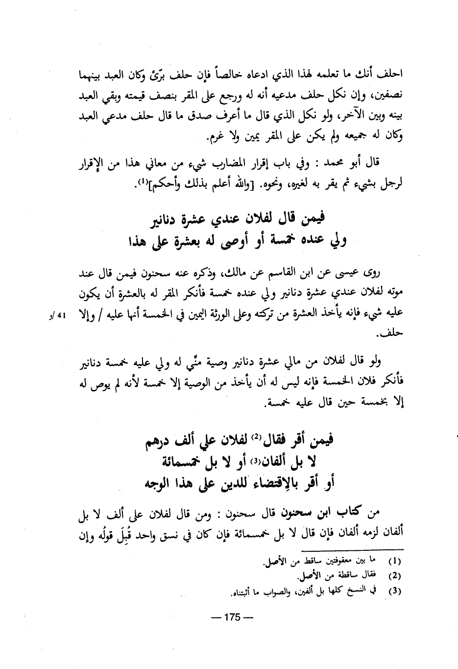 من كتاب ابن سحنون قال سحنون: ومن قال لفلان علي ألف لا بل ألفان لزمه ألفان فإن قال لا بل خمسمائة فإن كان في نسق واحد قبل قوله وإن