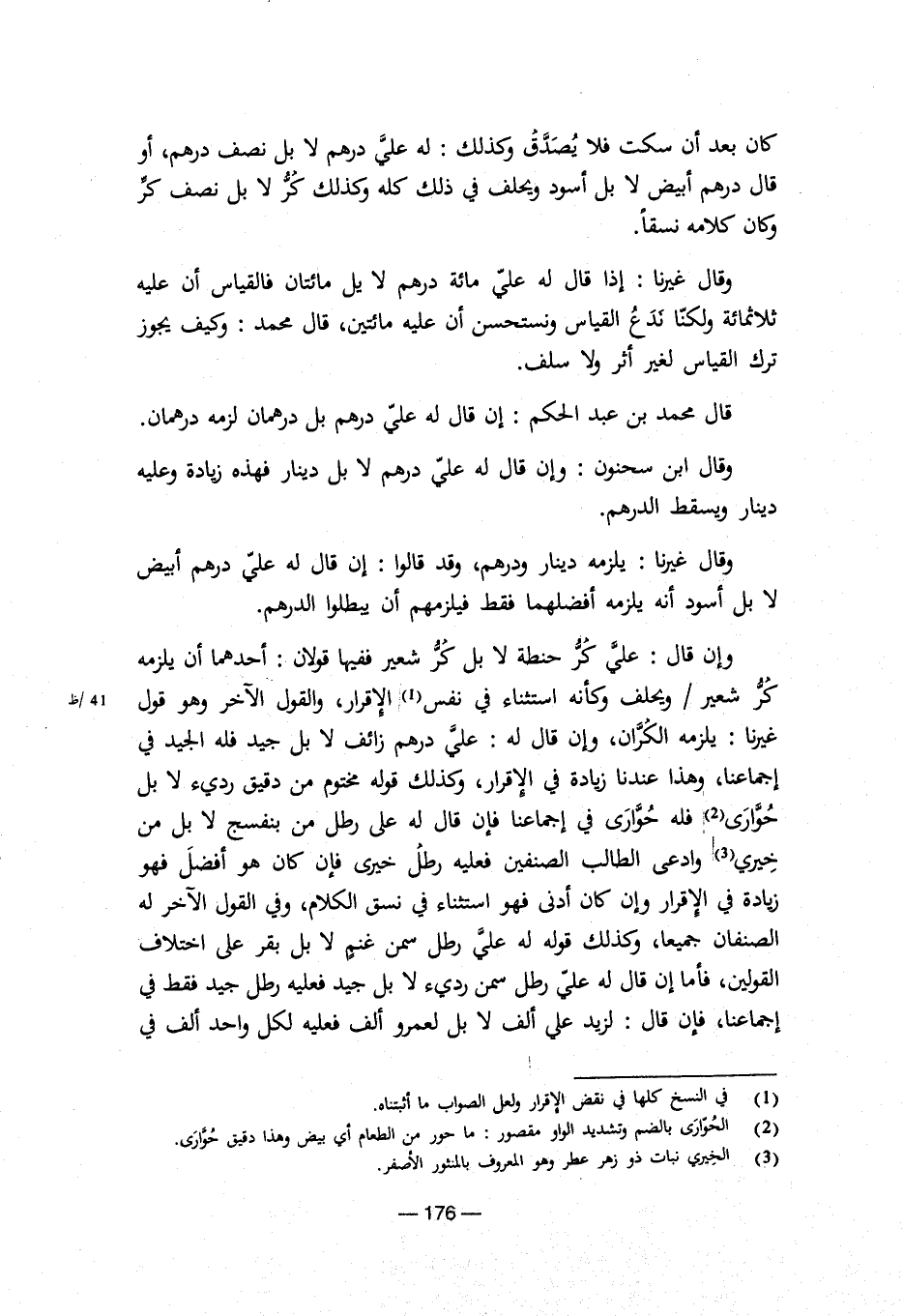 وقال غيرنا: إذا قال له علي مائة درهم لا يل مائتان فالقياس أن عليه ثلاثمائة ولكنا ندع القياس ونستحسن أن عليه مائتين، قال محمد: وكيف يجوز ترك القياس لغير أثر ولا سلف.