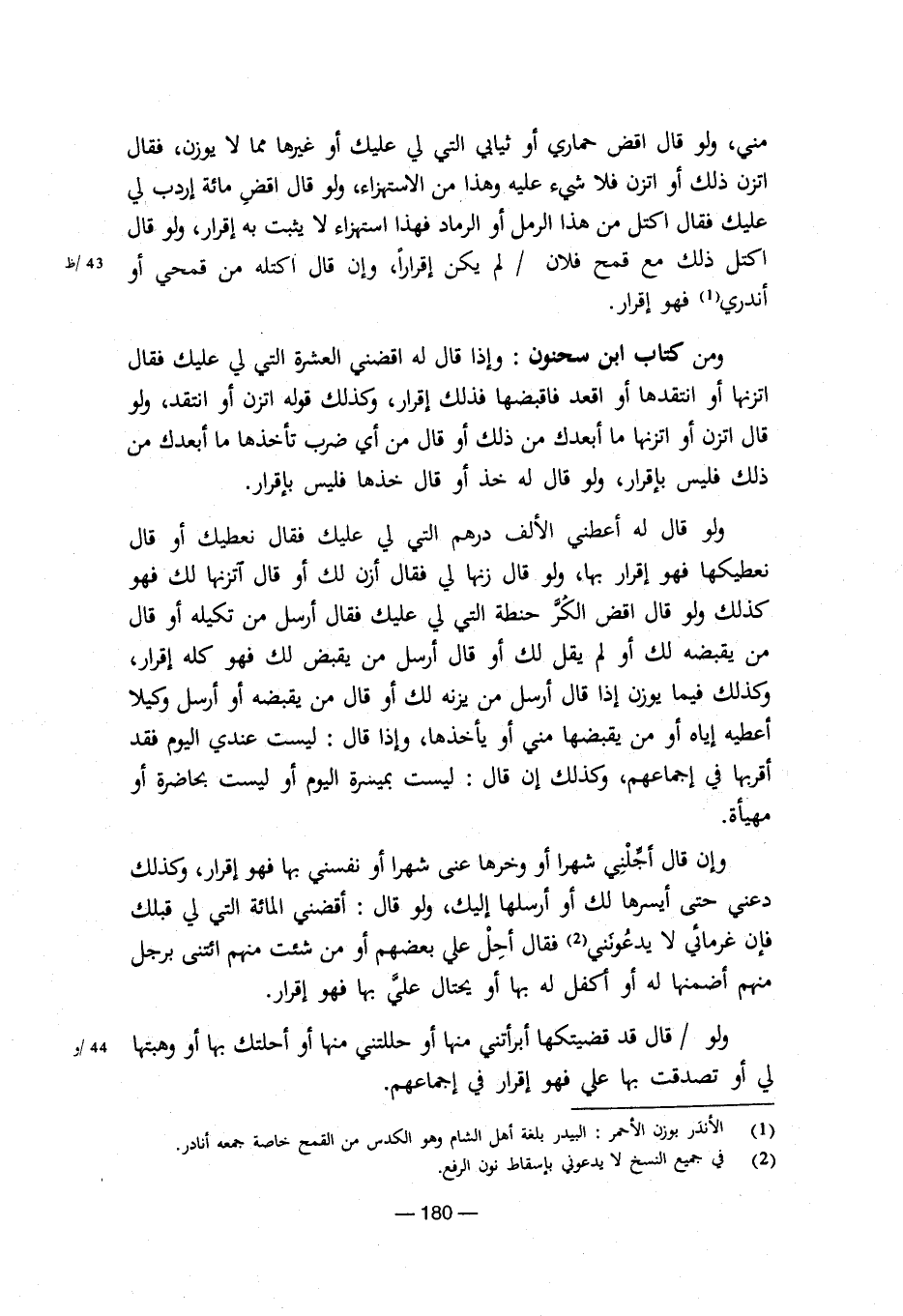 ومن كتاب ابن سحنون: وإذا قال له اقضني العشرة التي لي عليك فقال اتزنها أو انتقدها أو اقعد فاقبضها فذلك إقرار، وكذلك قوله اتزن او انتقد، ولو قال اتزن أو اتزنها ما أبعدك من ذلك أو قال من أي ضرب تأخذها ما أبعدك من ذلك فليس بإقرار، ولو قال له خذ أو قال خذها فليس بإقرار.