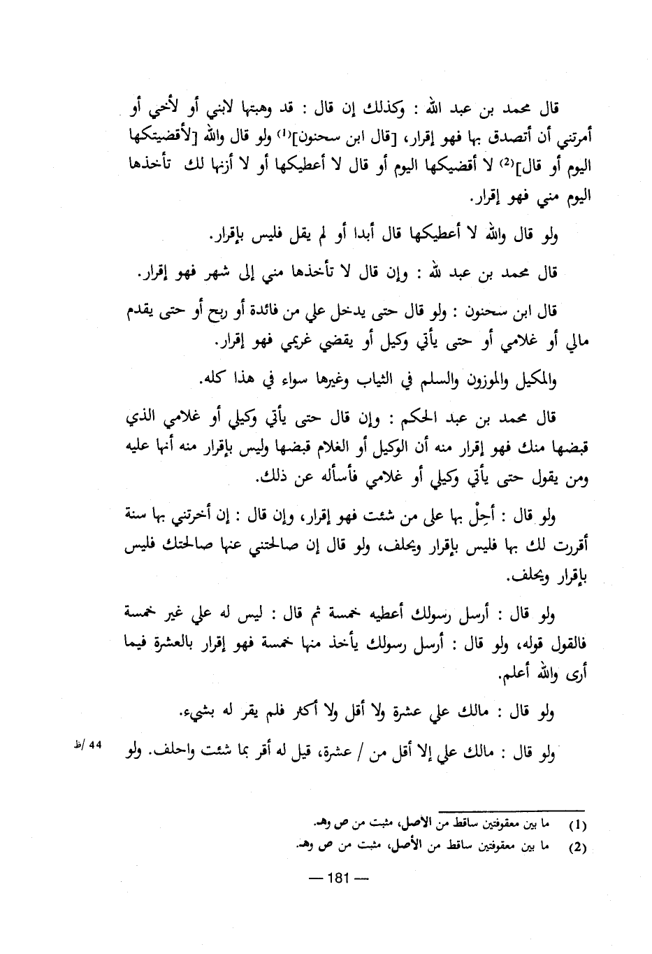 قال محمد بن عبد الحكم: وإن قال حتي يأتي وكيلي أو غلامي الذي قبضها منك فهو إقرار منه أن الوكيل أو الغلام قبضها وليس بإقرار منه أنها عليه ومن يقول حتي يأتي وكيلي أو غلامي فأسأله عن ذلك.