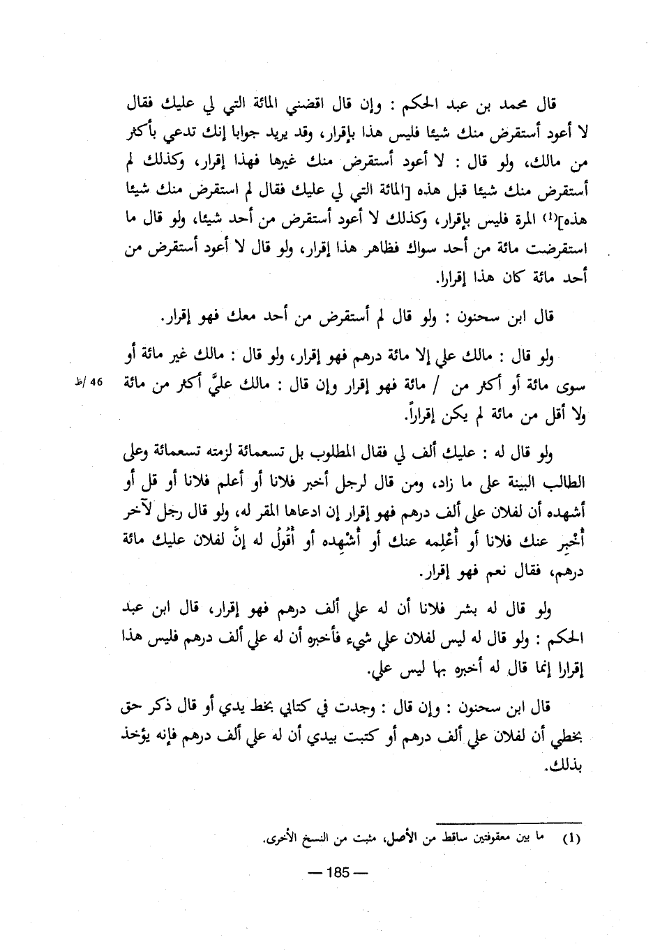 قال محمد بن عبد الحكم: وإن قال اقضني المائة التي لي عليك فقال لا أعود أستقرض منك شيئا فليس هذا بإقرار، وقد يريد جوابا إنك تدعي بأكثر من مالك، ولو قال: لا أعود استقرض منك غيرها فهذا إقرار، وكذلك لم أستقرض منك شيئا قبل هذه [المائة التي لي عليك فقال لم استقرض منك شيئا هذه] (¬1) المرة فليس بإقرار، وكذلك لا أعود أستقرض من أحد شيئا، ولو قال ما استقرضت مائة من أحد سواك فظاهر هذا إقرار، ولو قال لا أعود أستقرض من أحد مائة كان هذا إقرارا.