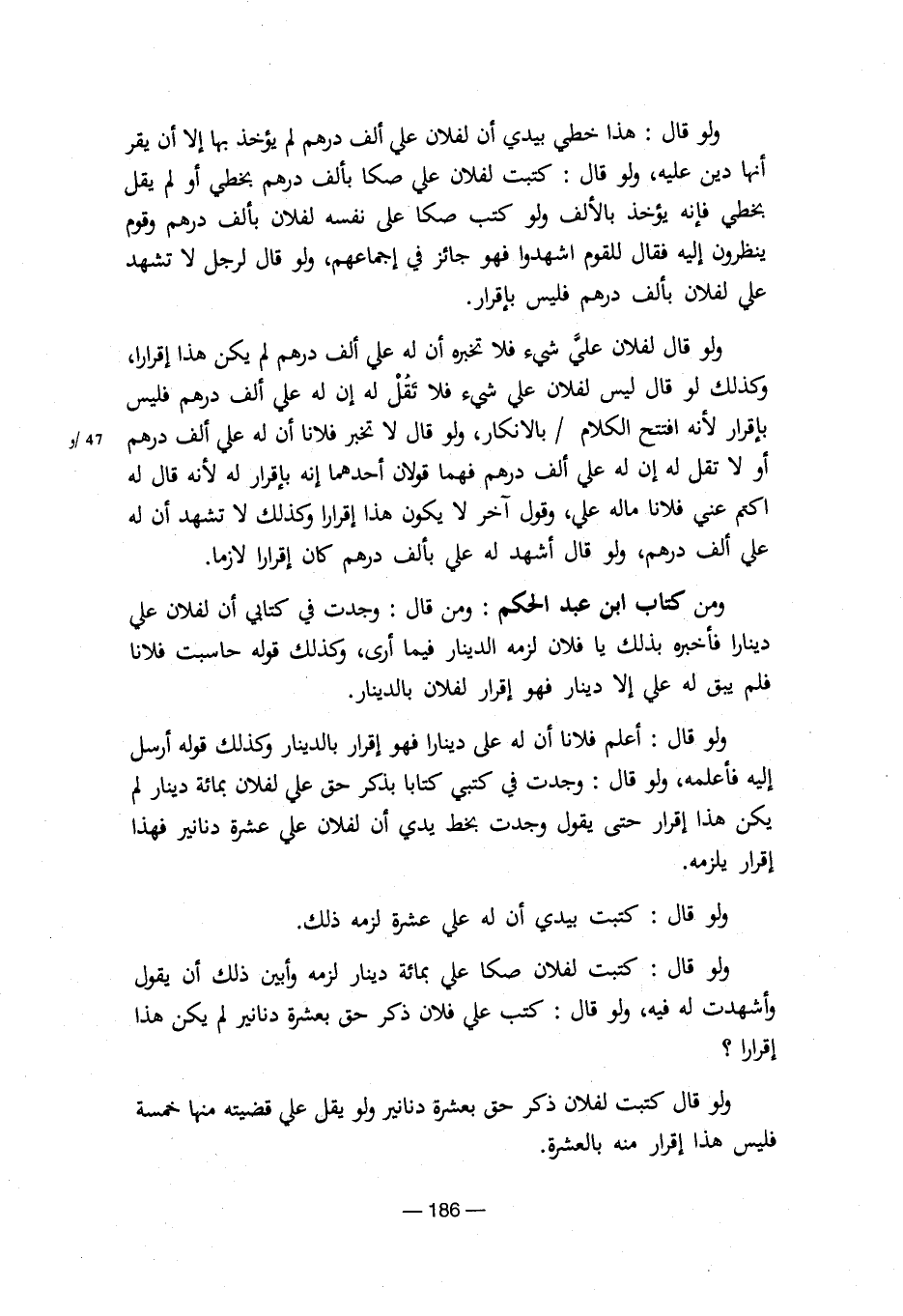 ومن كتاب ابن عبد الحكم: ومن قال: وجدت في كتابي أن لفلان علي دينارا فأخبره بذلك يا فلان لزمه الدينار فيما أري، وكذلك قوله حاسبت فلانا فلم يبق له علي إلا دينار فهو إقرار لفلان بالدينار.