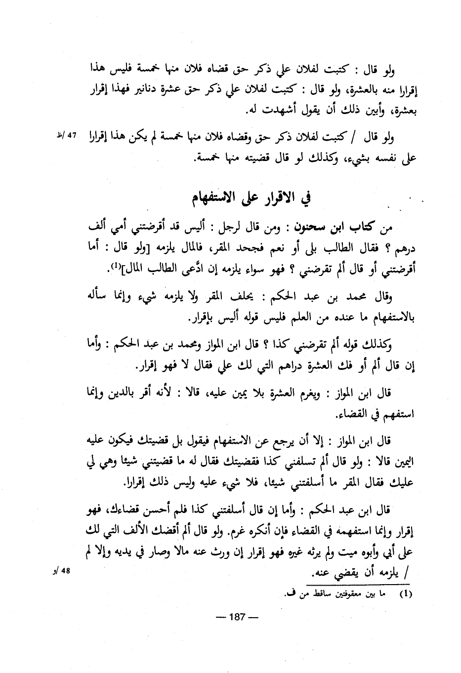 من كتاب ابن سحنون: ومن قال لرجل: أليس قد أقرضتني أمي ألف درهم؟ فقال الطالب بلي أو نعم فجحد المقر، فالمال يلزمه [ولو قال: أما أقرضتني أو قال ألم تقرضني؟ فهو سواء يلزمه إن ادعي الطالب المال] (¬1).