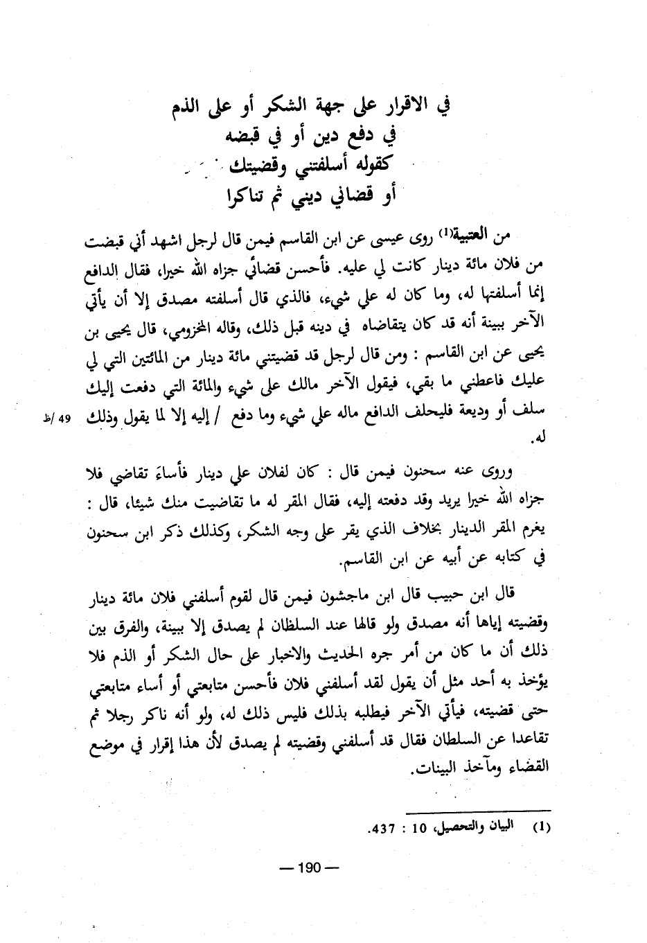 قال ابن حبيب قال ابن ماجشون فيمن قال لقوم أسلفني فلان مائة دينار وقضيته إياها أنه مصدق ولو قالها عند السلطان لم يصدق إلا ببينة، والفرق بين ذلك أن ما كان من أمر جره الحديث والأخبار علي حال الشكر أو الذم فلا يؤخذ به أحد مثل أن يقول لقد أسلفني فلان فأحسن متابعتي أو أساء متابعتي حتي قضيته، فيأتي الآخر فيطلبه بذلك فليس ذلك له، ولو أنه ناكر رجلا ثم تقاعدا عن السلطان فقال قد أسلفني وقضيته لم يصدق لأن هذا إقرار في موضع القضاء ومآخذ البينات.