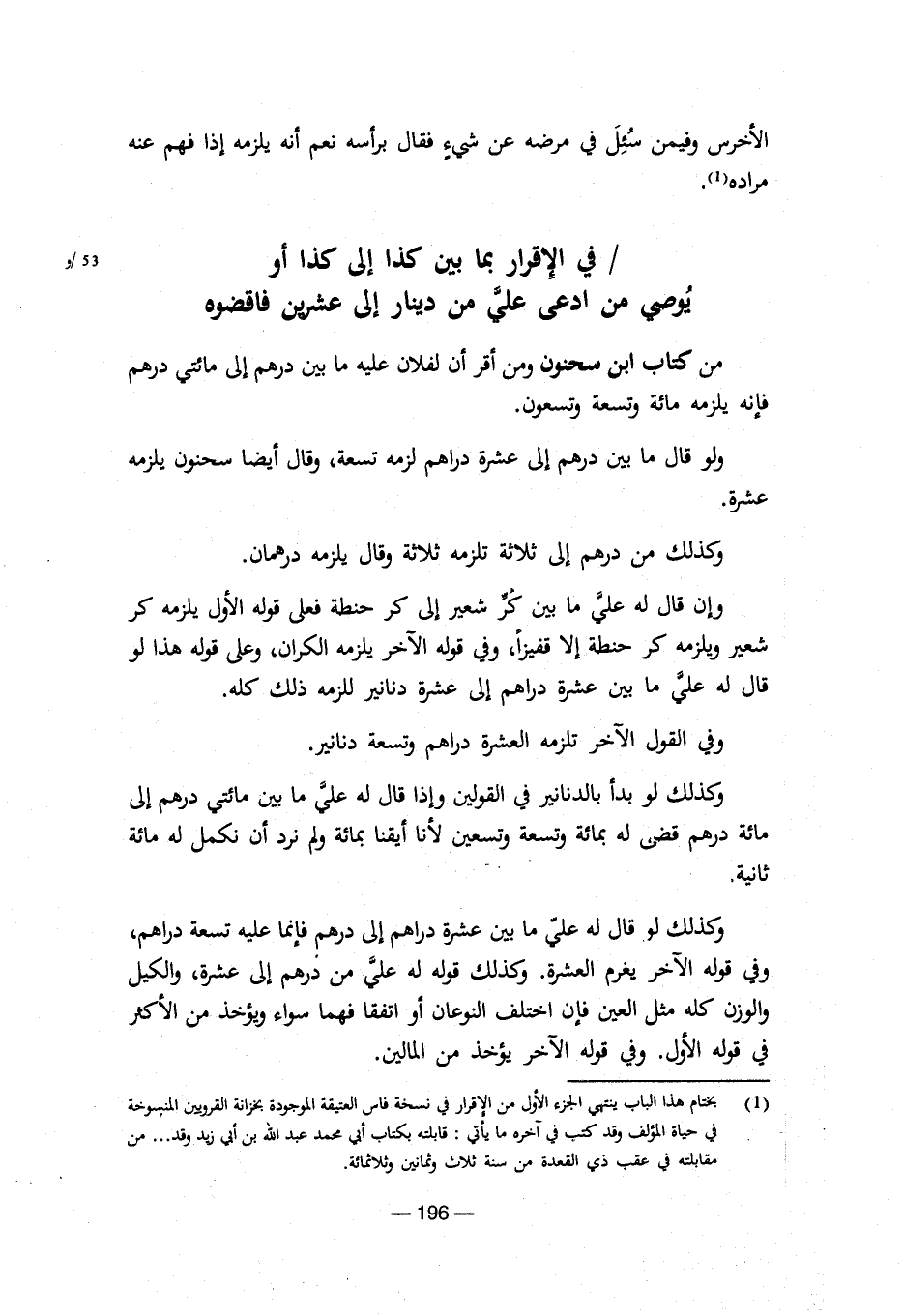 من كتاب ابن سحنون ومن أقر أن لفلان عليه ما بين درهم إلي مائتي درهم فإنه يلزمه مائة وتسعة وتسعون.