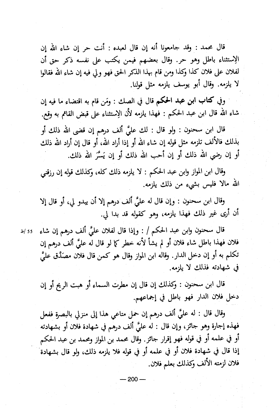 قال محمد: وقد جامعونا أنه إن قال لعبده: انت حر إن شاء الله إن الاستثناء باطل وهو حر. وقال بعضهم فيمن يكتب علي نفسه ذكر حق أن لفلان علي فلان كذا وكذا ومن قام بهذا الذكر الحق فهو ولي فيه إن شاء الله فقالول لا يلزمه. وقال أبو يوسف يلزمه مثل قولنا.