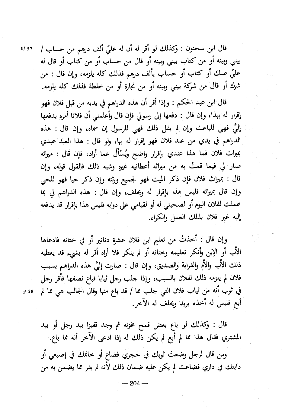 قال ابن سحنون: وكذلك لو أقر له أن له علي ألف درهم من حساب / بيني وبينه أو من كتاب بيني وبينه أو قال من حساب أو من كتاب أو قال له علي صك أو كتاب أو حساب بألف درهم فذلك مله يلزمه، وإن قال: من شرك أو قال من شركة بيني وبينه أو من تجارة أو من خلطة فذلك كله يلزمه.