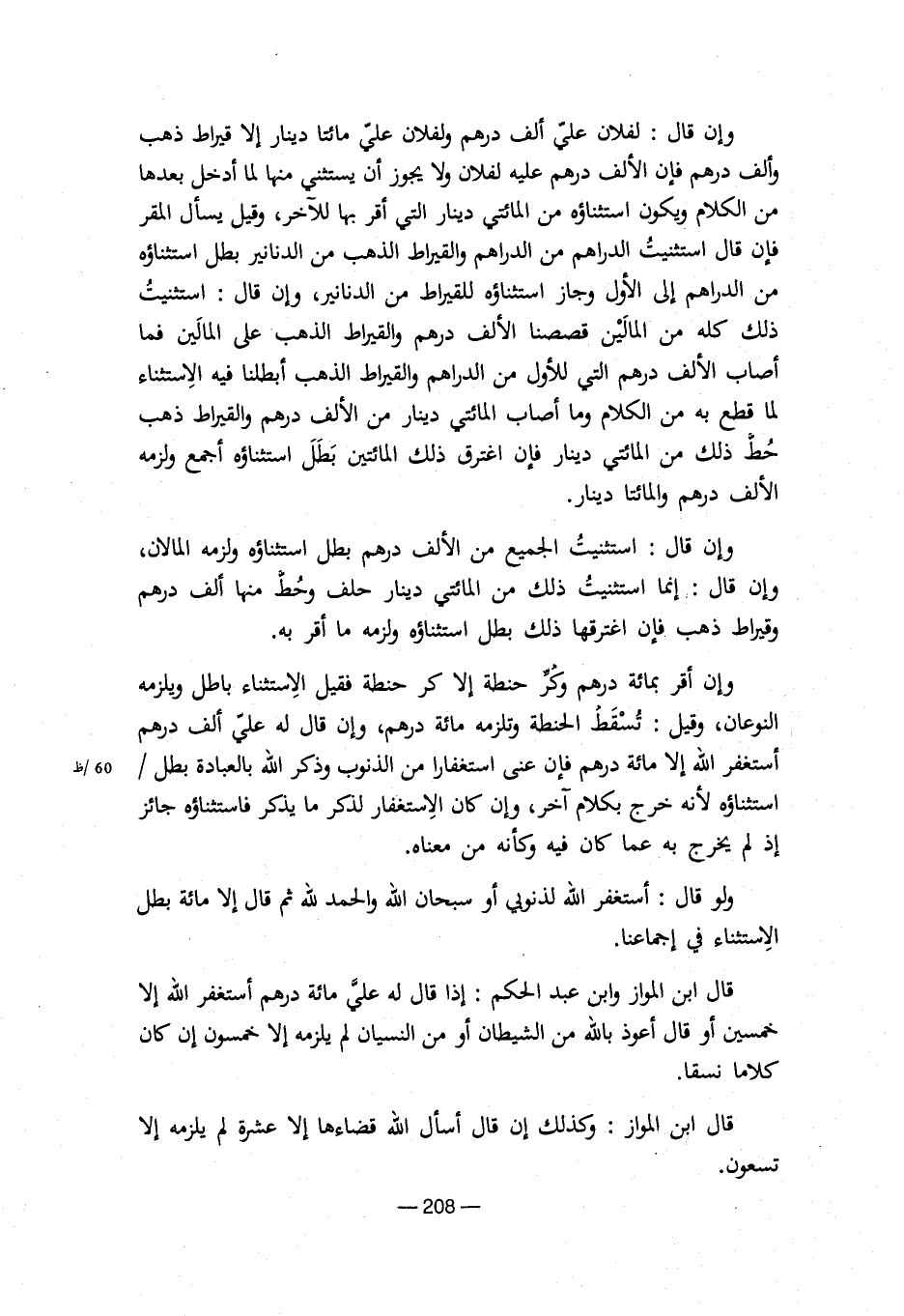 قال ابن المواز وابن عبد الحكم: إذا قال له علي مائة درهم أستغفر الله إلا خمسين أو قال أعوذ بالله من الشيطان أو من النسيان لم يلزمه إلا خمسون إن كان كلاما نسقا.