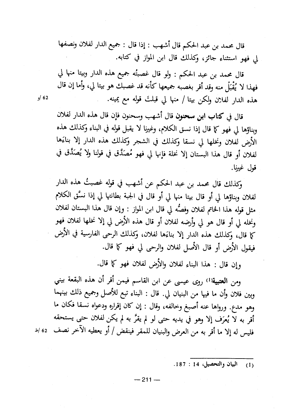 وكذلك قال محمد بن عبد الحكم عن أشهب في قوله غصبت هذه الدار لفلان وبناؤها لي أو قال بيتا منها لي أو قال في الجبة بطانتها لي إذا نسق الكلام مثل قوله هذا الخاتم لفلان وفصه لي قال ابن المواز: وإن قال هذا البستان لفلان ونخله لي أو قال هو لي وأرضه لفلان أو قال هذه الأرض لي إلا نخلها لفلان فهو كما قال، وكذلك هذه الدار إلا بناءها لفلان، وكذلك الرحي الفارسية في الأرض فيقول الأرض أو قال الأصل لفلان والرحي لي فهو كما قال.
