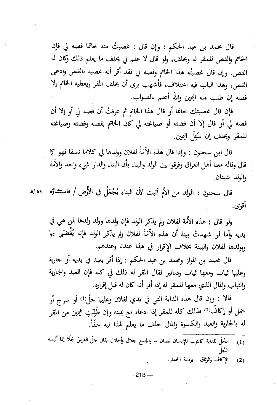 قالا: وإن قال هذه الدابة التى في يدى لفلان وعليها جل (¬1) أو سرج أو حمل أو إكاف (¬2) فذلك كله للمقر إذا ادهاه مع يمينه وإن طلبت اليمين من المقر له الجارية والعبد والكسوة والمال حلف ما يعلم لهذا فيه حقا.
