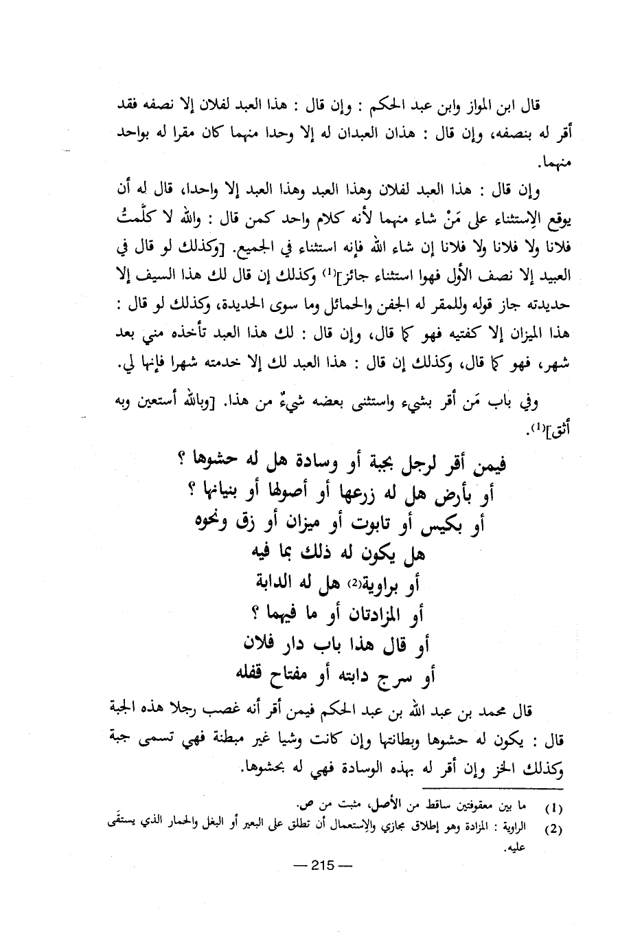 وإن قال: هذا العبد لفلان وهذا العبد وهذا العبد إلا واحدا، قال لة أن يوقع الاستثناء على من شاء منهما لأنة كلام واحد كمن قال: واللة لا كلمت فلانا ولا فلانا ولا فلانا إن شاء اللة فغنة استثناء فى الجميع. (وكذلك لو قال فى العبيد إلا نصف الأول فهو استثناء جائز) (¬1) وكذلك إن قال لك هذا السيف إلا حديدتة جاز قولة وللمقر لة الجفن والحمائل وما سوى الحديدة، وكذلك لو قال: هذا الميزان إلا كفتية فهو كما قال، وإن قال: لك هذا العبد تأخذة منى بعد شهر، فهو كما قال، وكذلك إن قال: هذا العبد لك إلا خدمتة شهرا فإنها لى. وفى باب من أقر بشىء واستثنى بعضة شىء من هذا. (وباللة أستعين وبة أثق)