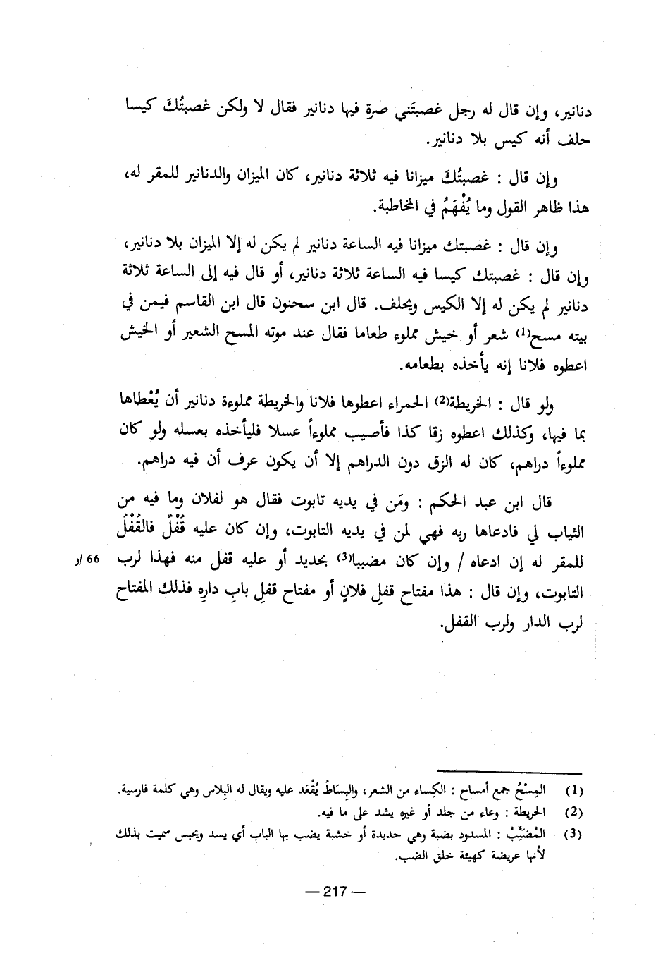 وإن قال: غصبتك ميزانا فية الساعة دنانير لم يكن لة إل ال الميزان بلا دنانير، وإن قال: غصبتك كيسا فية الساعة ثلاثة دنانير، أو قال فية الى الساعة ثلاثة دنانير لم يكن لة إلا الكيس ويحلف. قال ابن سحنون قال ابن القاسم فيمن فى بيتة مسح (¬1) شعر أو خيش مملوء طعاما فقال عند موتة المسح الشعير أو الخيش اعطوة فلانا إنة يأخذة بطعامة.