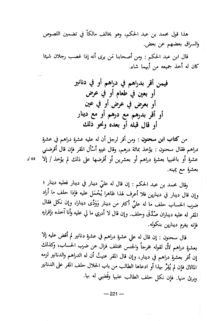 هذا قول محمد بن عبد الحكم، وهو يخالف مالكا فى تضمين اللصوص والسراق بعضهم عن بعض. قال ابن عبد الحكم: ومن أصحابنا من يرى أنة إذا غصب رجلان شيئا كان لة أخذ جميعة من أيهما شاء. فيمن أقر بدراهم فى دراهم أو فى دنانير أو بعين فى طعام أو فى عرض أو بعرض فى عرض أو فى عين أو أقر بدرهم مع درهم أو مع دينار أو قال قبلة أو بعدة ونحو ذلك من كتاب ابن سحنون: ومن أقر لرجل أن لة علية عشرة دراهم فى عشرة دراهم فقال سحنون: يؤخذ بمائة درهم، وقال غيرة أسأل المقر فإن قال أقرضنى عشرة أو باعنيها بعشرة دراهم أو بعشرين أو أقرضها على ذلك لم يؤخذ / إلا 68/وبعشرة مع يمينة.
