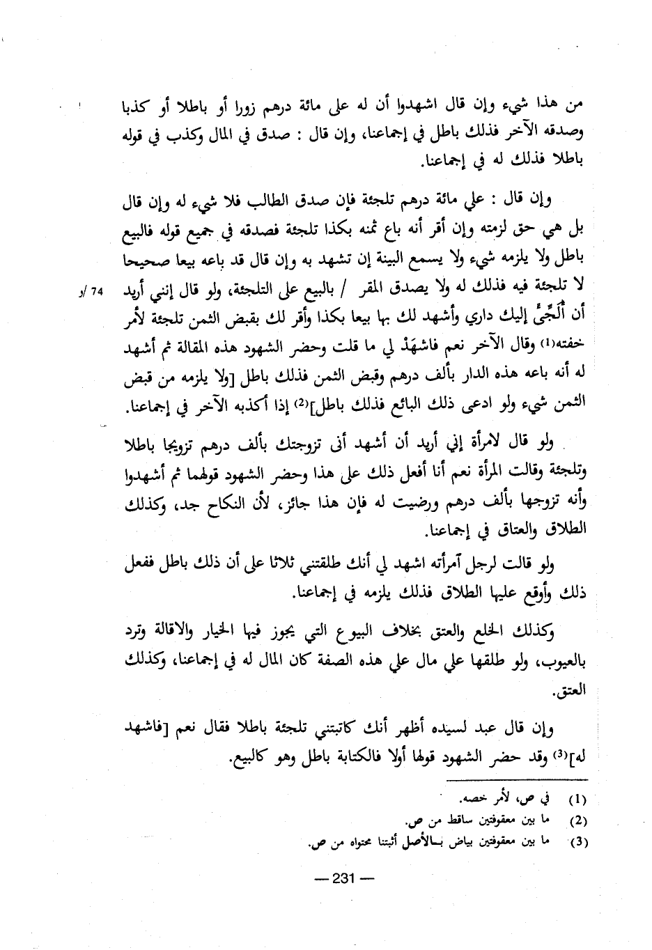 من هذا شىء وإن قال اشهدوا أن لة على مائة درهم زورا أو باطلا أو كذبا وصدقة الآخر فذلك باطل فى إجماعنا، وإن قال: صدق فى المال وكذب فى قولة باطلا فذلك لة فى إجماعنا. وإن قال: على مائة درهم تلجئة فإن صدق الطالب فلا شىء لة وإن قال بل هى حق لزمتة وإن أقر أنة باع ثمنة بكذا تلجئة فصدقة فى جميع قولة فالبيع باطل ولا يلزمة شىء ولا يسمع البينة إن تشهد بة وإن قال قد باعة بيعا صحيحا لا تلجئة فية فذلك لة ولا يصدق المقر / بالبيع على التلجئة، ولو قال إننى أريد 74/وأن ألجى إليك دارى وأشهد لك بها بيعا بكذا وأقر لك بقبض الثمن تلجئة لأمر خفتة (¬1) وقال الآخر نعم فاشهد لى ما قلت وحضر الشهود هذة المقالة ثم أشهد لة أنة باعة هذة الدار بألف درهم وقبض الثمن فذلك باطل (ولا يلزمة من قبض الثمن شىء ولو ادعى ذلك البائع فذلك باطل) (¬2) إذا أكذبة الآخر فى إجماعنا. ولو قال لامرأة إنى أريد أن أشهد أنى تزوجتك بألف درهم تزويجا باطلا وتلجئة وقالت المرأة نعم أنا أفعل ذلك على هذا وحضر الشهود قولهما ثم أشهدوا وأنة تزوجها بألف درهم ورضيت لة فإن هذا جائز، لأن النكاح جد، وكذلك الطلاق والعتاق فى أجماعنا. ولو قالت لرجل آمرأتة اشهد لى أنك طلقتنى ثلاثا على أن ذلك باطل ففعل ذلك وأوقع عليها الطلاق فذلك يلزمة فى إجماعنا. وكذلك الخلع والعتق بخلاف البيوع التى يجوز فيها الخيار والاقالة وترد بالعيوب، ولو طلقها على مال على هذة الصفة كان المال لة فى إجماعنا، وكذلك العتق. وإن قال عبد لسيدة أظهر أنك كاتبتنى تلجئة باطلا فقال نعم (فاشهد لة) (¬3) وقد حضر الشهود قولها أولا فالكتابة باطل وهو كالبيع.