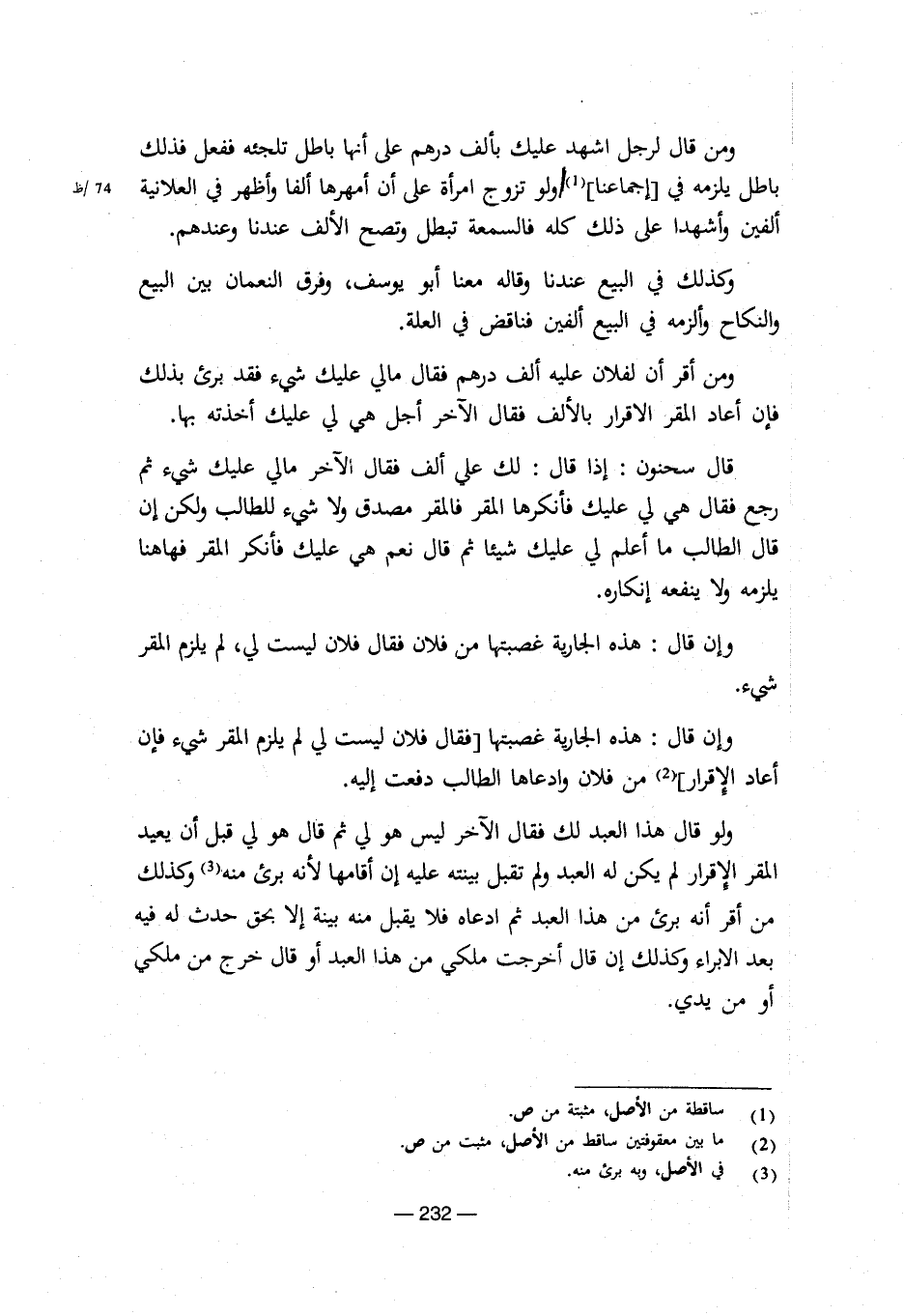 ومن قال لرجل اشهد عليك بألف درهم على أنها باطل تلجئة ففعل فذلك باطل يلزمة فى (إجماعنا) (¬1) / ولو تزوج امرأة على أن أمهرها ألفا وأظهر فى العلانية 74/ظ ألفين وأشهدا على ذلك كلة فالسمعة تبطل وتصح الألف عندنا وعندهم. وكذلك فى البيع عندنا وقالة معنا أبو يوسف، وفرق النعمان بين البيع والنكاح وألزمة فى البيع ألفين فناقض فى العلة. ومن أقر أن لفلان علية ألف درهم فقال مالى عليك شىء فقد برىء بذلك فإن أعاد المقر الاقرار بالألف فقال الآخر أجل هى لى عليك أخذتة بها. قال سحنون: إذا قال: لك على ألف فقال الآخر مالى عليك شىء ثم رجع فقال هى لى عليك فأنكرها المقر فالمقر مصدق ولا شىء للطالب ولكن إن قال الطالب ما أعلم لى عليك شيئا ثم قال نعم هى عليك فأنكر المقر فهاهنا يلزمة ولا ينفعة إنكارة. وإن قال: هذة الجارية غصبتها من فلان فقال فلان ليست لى، لم يلزم المقر شىء وإن قال: هذة الجارية غصبتها (فقال فلان ليست لى لم يلزم المقر شىء فإن أعاد الإقرار) (¬2) من فلان وادعاها الطالب دفعت إلية. ولو قال هذا العبد لك فقال الآخر ليس هو لى ثم قال هو لى قبل أن يعيد المقر الإقرار لم يكن لة العبد ولم تقبل بينتة علية إن أقامها لأنة برىء منة (¬3) وكذلك. من أقر أنة برىء من هذا العبد ثم ادعاة فلا يقبل منة بينة إلا بحق حدث لة فية بعد الابراء وكذلك إن قال أخرجت ملكى من هذا العبد أو قال خرج من ملكى أو من يدى.