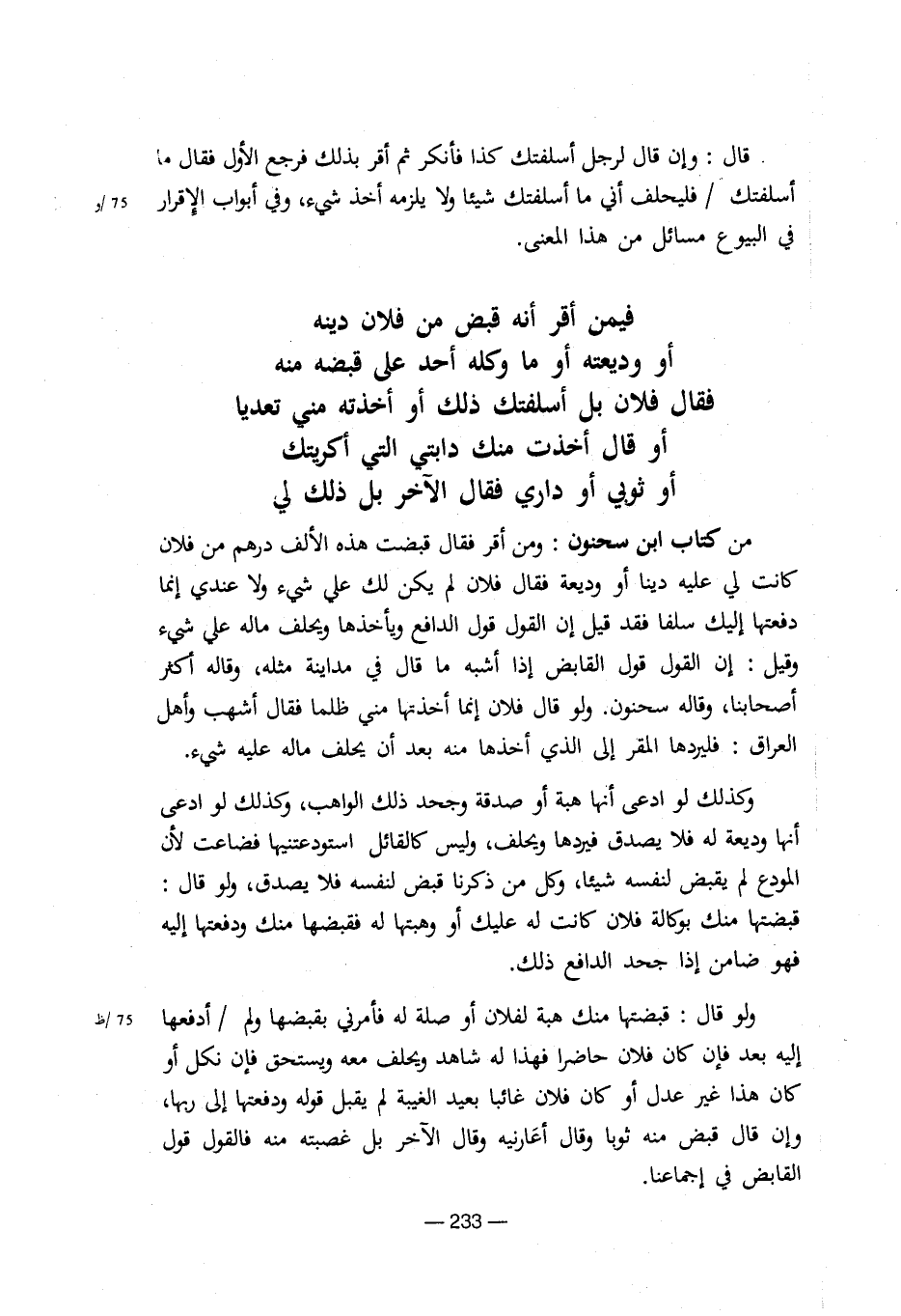 قال: وإن قال لرجل أسلفتك كذا فأنكر ثم أقر بذلك فرجع الأول فقال ما أسلفتك / فليحلف أنى ما أسلفتك شيئا ولا يلزمة أخذ شىء، وفى أبواب الإقرار 75/وفى البيوع مسائل من هذا المعنى. فيمن أقر أنة قبض من فلان دينة أو وديعتة أو ما وكلة أحد على قبضة منة فقال فلان بل أسلفتك ذلك أو أخذتة منى تعديا أو قال أخذت منك دابتى التى أكريتك أو ثوبى أو دارى فقال الآخر بل ذلك لى من كتاب ابن سحنون: ومن أقر فقال قبضت هذة الألف درهم من فلان كانت لى علية دينا أو وديعة فقال فلان لم يكن لك على شىء ولا عندى إنما دفعتها إليك سلفا فقد قيل إن القول قول الدافع ويأخذها ويحلف مالة على شىء وقيل: إن القول قول القابض إذا أشبة ما قال فى مداينة مثلة، وقالة أكثر أصحابنا، وقالة سحنون. ولو قال فلان إنما أخذتها منى ظلما فقال أشهب وأهل العراق: فليردها المقر إلى الذى أخذها منة بعد أن يحلف مالة علية شىء. وكذلك لو ادعى أنها هبة أو صدقة وجحد ذلك الواهب، وكذلك لو ادعى أنها وديعة لة فلا يصدق فيردها ويحلف، وليس كالقائل استودعتنيها فضاعت لأن المودع لم يقبض لنفسة شيئا، وكل من ذكرنا قبض لنفسة فلا يصدق، ولو قال: قبضتها منك بوكالة فلان كانت لة عليك أو وهبتها لة فقبضها منك ودفعتها إلية فهو ضامن إذا جحد الدافع ذلك. ولو قال: قبضتها منك هبة لفلان أو صلة لة فأمرنى بقبضها ولم / أدفعها 75/ظ إلية بعد فإن كان فلان حاضرا فهذا لة شاهد ويحلف معة ويستحق فإن نكل أو كان هذا غير عدل أو كان فلان غائبا بعيد الغيبة لم يقبل قولة ودفعتها إلى ربها، وإن قال قبض منة ثوبا وقال أعارنية وقال الآخر بل غصبتة منة فالقول قول القابض فى إجما عنا.