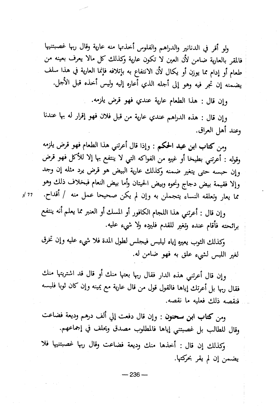 ولو أقر فى الدنانير والدراهم والفلوس أخذتها منة عارية وقال ربها غصبتنيها فالمقر بالعارية ضامن لأن العين لا تكون عارية وكذلك كل مالا يعرف بعينة من طعام أو إدام مما يوزن أو يكال لأن الانتفاع بة بإتلافة فإنما العارية فى هذا سلف يضمنة إن تجر فية وهو إلى أجلة الذى أعارة إلية وليس أخذة قبل الأجل. وإن قال: هذا الطعام عارية عندى فهو قرض يلزمة. وإن قال: هذة الدراهم عندى عارية من قبل فلان فهو إقرار لة بها عندنا وعند أهل العراق. ومن كتاب ابن عبد الحكم: وإذا قال أعرتنى هذا الطعام فهو قرض يلزمة وقولة: أعرتنى بطيخا أو غيرة من الفواكة التى لا ينتفع بها إلا للأكل فهو قرض وإن حبسة حتى يتغير ضمنة وكذلك عارية البيض هو قرض يرد مثلة إن وجد وإلا فقيمة بيض دجاج ونحوة وبيض الحيتان وأما بيض النعام فبخلاف ذلك وهو مما يعار وتعلقة النساء يتجملن بة وإن لم يكن صحيحا عمل منة / أقداح. 77/ووإن قال: أرتنى هذا اللجام الكافور أو المسك أو العنبر مما يعلم أنة ينتفع برائحتة فأقام عندة وتغير للقدم فليردة ولا شىء علية. وكذلك الثوب يعيرة إياة ليلبس فيجلس لطول المدة فلا شىء علية وإن تخرق لغير اللبس لشىء علق بة فهو ضامن لة. وإن قال أعرتنى هذة الدار فقال ربها بعتها منك أو قال قد اشتريتها منك فقال ربها بل أعرتك إياها فالقول قول من قال عارية مع يمينة وإن كان ثوبا فلبسة فنقصة ذلك فعلية ما نقصة. ومن كتاب ابن سحنون: وإن قال دفعت إلى ألف درهم وديعة فضاعت وقال للطالب بل غصبتنى إياها فالمطلوب مصدق ويحلف فى إجماعهم. وكذلك إن قال: أخذها منك وديعة فضاعت وقال ربها غصبتنيها فلا يضمن إن لم يقر بحركتها.