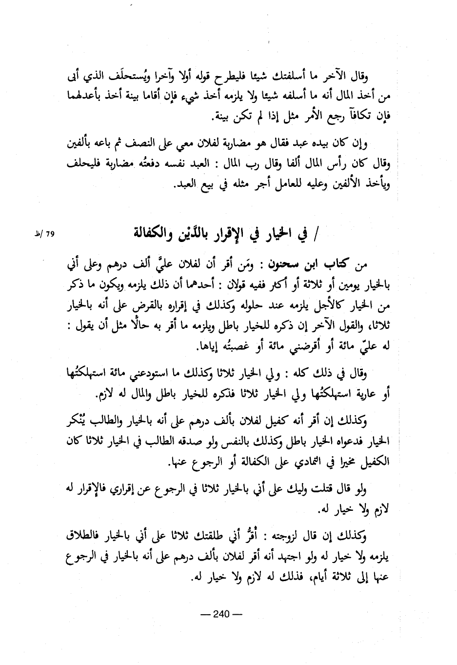 وقال الآخر ما أسلفتك شيئا فليطرح قولة أولا وآخرا ويستحلف الذى أبى من أخذ المال أنة ما أسلفة شيئا ولا يلزمة أخذ شىء فإن أقاما بينة أخذ بأعدلهما فإن تكافآ رجع الأمر مثل إذا لم تكن بينة. وإن كان بيدة عبد فقال هو مضاربة لفلان معى على النصف ثم باعة بألفين وقال كان رأس المال ألفا وقال رب المال: العبد نفسة دفعتة مضاربة فليحلف ويأخذ الألفين وعلية للعامل أجر مثلة فى بيع العبد. / فى الخيار فى الإقرار بالدين والكفالة 79/ظ من كتاب ابن سحنون: ومن أقر أن لفلان على ألف درهم وعلى أنى بالخيار يومين أو ثلاثة أو أكثر ففية قولان: أحدهما أن ذلك يلزمة ويكون ما ذكر من الخيار كالأجل يلزمة عند حلولة وكذلك فى إقرارة بالقرض على أنة بالخيار ثلاثا، والقول الآخر إن ذكرة للخيار باطل ويلزمة ما أقر بة حالا مثل أن يقول: لة على مائة أو أقرضنى مائة أو غصبتة إياها. وقال فى ذلك كلة: ولى الخيار ثلاثا وكذلك ما استودعنى مائة استهلكتها أو عارية استهلكتها ولى الخيار ثلاثا فذكرة للخيار باطل والمال لة لازم. وكذلك إن أقر أنة كفيل لفلان بألف درهم على أنة بالخيار والطالب ينكر الخيار فدعواة الخيار باطل وكذلك بالنفس ولو صدقة الطالب فى الخيار ثلاثا كان الكفيل مخيرا فى التمادى على الكفالة أو الرجوع عنها. ولو قال قتلت وليك على أنى بالخيار ثلاثا فى الرجوع عن إقرارى فالإقرار لة لازم ولا خيار لة. وكذلك إن قال لزوجتة: أقر طلقتك ثلاثا على أنى بالخيار فالطلاق يلزمة ولا خيار لة ولو اجتهد أنة أقر لفلان بألف درهم على أنة بالخيار فى الرجوع عنها إلى ثلاثة أيام، فذلك لة لازم ولا خيار لة.