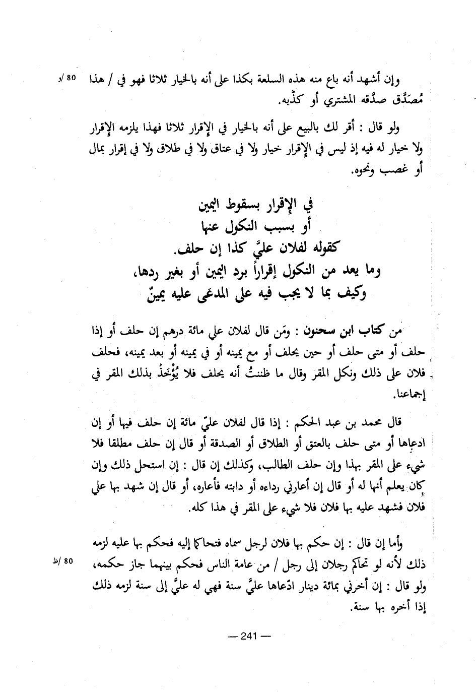 وإن أشهد أنة باع منة هذة السلعة بكذا على أنة بالخيار ثلاثا فهو فى / هذا 80/ومصدق صدقة المشترى أو كذبة. ولو قال: أقر لك بالبيع على أنة بالخيار فى الإقرار ثلاثا فهذا يلزمة الإقرار ولا خيار لة فية إذ ليس فى الإقرار خيار ولا فى عتاق ولا فى طلاق ولا فى إقرار بمال أو غصب ونحوة. فى الإقرار بسقوط اليمين أو بسبب النكول عنها كقولة لفلان على كذا إن حلف. وما يعد من النكول إقرارا برد اليمين أو بغير ردها، وكيف بما لا يجب فية على المدعى علية يمين من كتاب ابن سحنون: ومن قال لفلان على مائة درهم إن حلف أو إذا حلف أو متى حلف أو حين يحلف أو مع يمينة أو فى يمينة أو بعد يمينة، فحلف فلان على ذلك ونكل المقر وقال ما ظننت أنة يحلف فلا يِخذ بذلك المقر فى إجماعنا. قال محمد بن عبد الحكم: إذا قال لفلان على مائة إن حلف فيها أو إن ادعاها أو متى حلف بالعتق أو الطلاق أو الصدقة أو قال إن حلف مطلقا فلا شىء على المقر بهذا وإن حلف الطالب، وكذلك إن قال: إن استحل ذلك وإن كان يعلم أنها لة أو قال إن أعارنى رداءة أو دابتة فأعارة، أو قال إن شهد بها على فلان فشهد علية بها فلان فلا شىء على المقر فى هذا كلة. وأما إن قال: إن حكم بها فلان لرجل سماة فتحاكهما إلية فحكم بها علية لزمة ذلك لأنة لو تحاكم رجلان إلى رجل / من عامة الناس فحكم بينهما جاز حكمة، 80/ظ ولو قال: إن أخرنى بمائة دينار ادعاها على سنة فهى لة على إلى سنة لزمة ذلك إذا أخرة بها سنة.