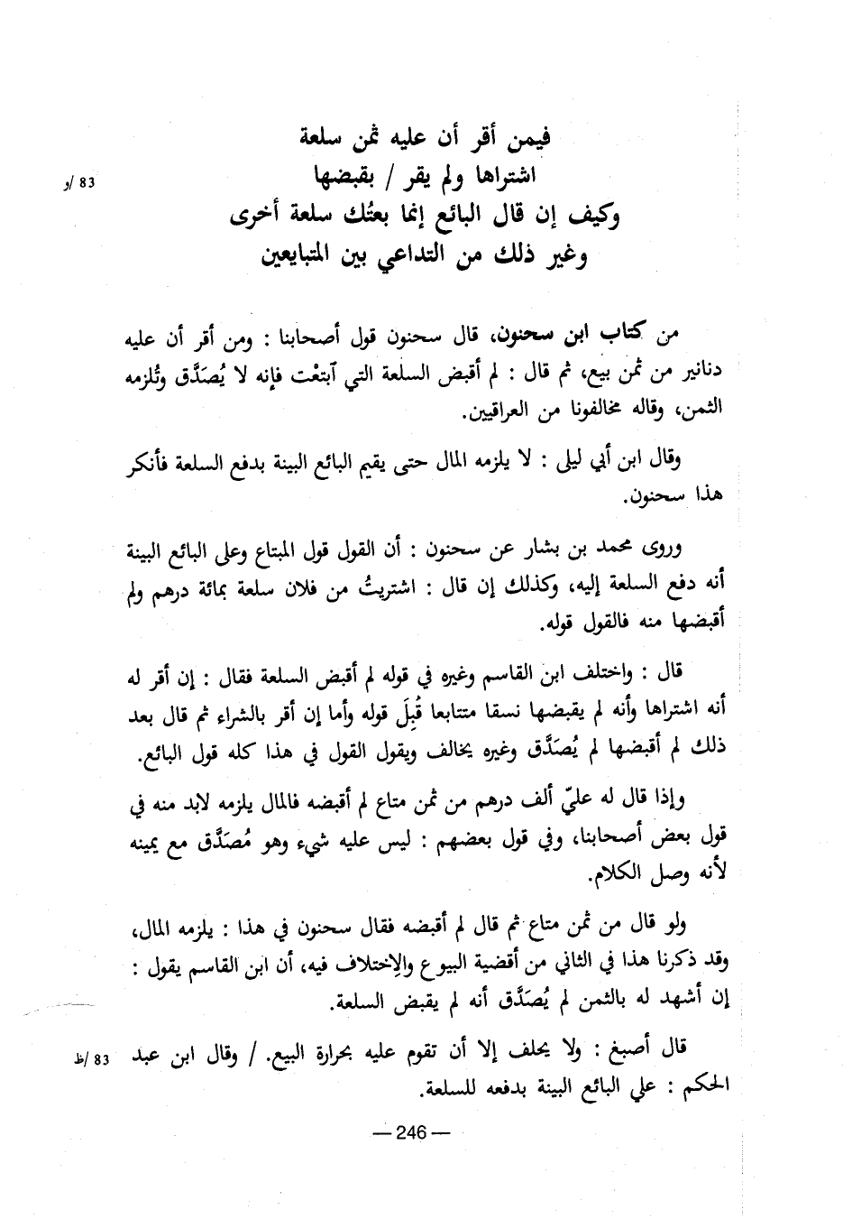فيمن أقر أن علية ثمن سلعة اشتراها ولم يقر / بقبضها 83/ووكيف إن قال البائع إنما بعتك سلعة أخرى وغير ذلك من التداعى بين المتبايعين من كتاب ابن سحنون، قال سحنون قوا أصحابنا: ومن أقر أن علية دنانير من ثمن بيع، ثم قال: لم أقبض السلعة التى ابتعت فإنة لا يصدق وتلزمة الثمن، وقالة مخالفونا من العراقيين. وقال ابن أبى ليلى: لا يلزمة المال حتى يقيم البائع البينة بدفع السلعة فأنكر هذا سحنون. وروى محمد بن بشار عن سحنون: أن القول قول المبتاع وعلى البائع البينة أنة دفع السلعة إلية، وكذلك إن قال: اشتريت من فلان سلعة بمائه درهم ولم أقبضها منة فالقول قولة. قال: واختلف ابن القاسم وغيرة فى قولة لم أقبض السلعة فقال: إن أقر لة أنة اشتراها وأنة لم يقبضها نسقا متتابعا قبل قولة وأما إن أقر بالشراء ثم قال بعد ذلك ثم أقبضها لم يصدق وغيرة يخالف ويقول القول فى هذا كلة قول البائع. وإذا قال لة على ألف درهم من ثمن متاع لم أقبضة فالمال يلزمة لابد منة فى قول بعض أصحابنا، وفى قول بعضهم: ليس علية شىء وهو مصدق مع يمينة لأنة وصل الكلام. ولو قال من ثمن متاع ثم قال لم أقبضة فقال سحنون فى هذا: يلزمة المال، وقد ذكرنا هذا فى الثانى من أقضية البيوع والاختلاف فية، أن ابن القاسم يقول: إن أشهد لة بالثمن لم يصدق أنة لم يقبض السلعة. قال أصبغ: ولا يحلف إلا أن تقوم علية بحرارة البيع. / وقال ابن عبد 83/ظ الحكم: على البائع البينة بدفعة للسلعة.