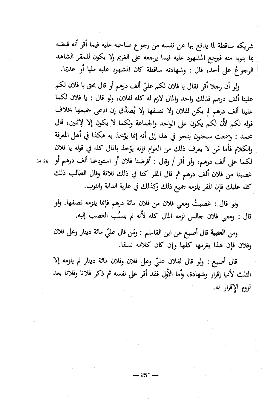 شريكة ساقطة لما يدفع بها عن نفسة من رجوع صاحبة علية فيما أقر أنة قبضة بما ينوية منة فيرجع المشهود علية فيما يرجعة على الغريم ولا يكون للمقر الشاهد الرجوع على أحد، قال: وشهادتة ساقطة كان المشهود علية مليا أو عديما. ولو أن رجلا أقر فقال يا فلان لكم على ألف درهم أو قال بحق يا فلان لكم علينا ألف درهم فذلك واحد والمال لازم لة كلة لفلان، ولو قال: يا فلان لكما علينا ألف درهم لم يكن لفلان إلا نصفها ولا يصدق إن ادعى جميعها بخلاف قولة لكم لأن لكم يكون على الواحد والجماعة ولكما لايكون إلا لاثنين، قال محمد: وسمعت سحنون ينحو فى هذا إلى أنة إنما يؤخذ بالمال كلة فى قولة يا فلان لكما على ألف درهم، ولو أقر / وقال: أقرضنا فلان أو استودعنا ألف درهم أو 86/ظ غصبنا من فلان ألف درهم ثم قال المقر كنا فى ذلك ثلاثة وقال الطالب ذلك كلة عليك فإن المقر يلزمة جميع ذلك وكذلك فى عارية الدابة والثوب. ولو قال: غصبت ومعى فلان من فلان مائة درهم فإنما يلزمة نصفها. ولو قال: ومعى فلان جالس لزمة المال كلة لأنة لم ينسب الغصب إلية. ومن العتبية قال أصبغ عن ابن القاسم: ومن قال على مائة دينار وعلى فلان وفلان فإن هذا يغرمها كلها وإن كان كلامة نسقا. قال أصبغ: ولو قال لفلان على وعلى فلان وفلان مائة دينار لم يلزمة إلا الثلث لأنها إقرار وشهادة، وأما الأول فقد أقر على نفسة ثم ذكر فلانا وفلانا بعد لزوم الإقرار لة.