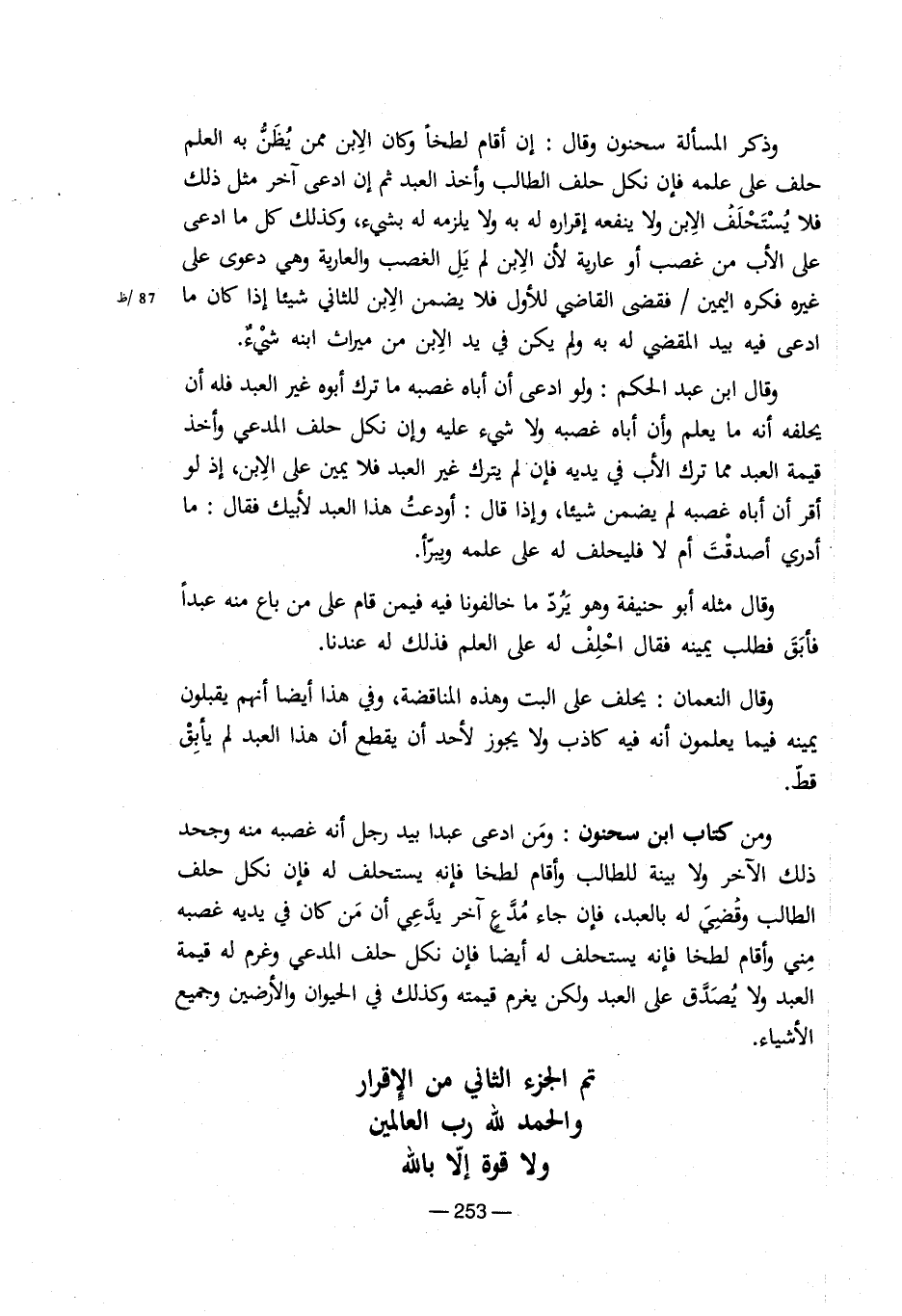 وذكر المسألة سحنون وقال: إن أقام لطخا وكان الابن ممن يظن بة العلم حلف على علمة فإن نكل حلف الطالب وأخذ العبد ثم إن ادعى آخر مثل ذلك فلا يستحلف الابن ولا ينفعة إقرارة لة بة ولا يلزمة لة بشىء، وكذلك كل ما ادعى على الأب من غصب أو عارية لأن الابن لم يل الغصب والعارية وهى دعوى على غيرة فكرة اليمين /فقضى القاضى للأول فلا يضمن الابن للثانى شيئا إذا كان ما 87/ظ ادعى فية بيد المقضى لة بة ولم يكن فى يد الابن من ميراث ابنة شىء. وقال ابن عبد الحكم: ولو ادعى أن أباة غصبة ما ترك أبوة غير العبد فلة أن يحلفة أنة ما يعلم وأن أباة غصبة ولا شىء علية وإن نكل حلف المدعى وأخذ قيمة العبد مما ترك الأب فى يدية فإن لم يترك غير العبد فلا يمين على الابن، إذ لو أقر أن أباة غصبة لم يضمن شيئا، وإذا قال: أودعت هذا العبد لأبيك فقال: ما أدرى أصدقت أم لا فليحلف لة على علمة ويبرأ. وقال مثلة أبو حنيفة وهو ير ما خالفونا فية فيمن قام على من باع منة عبدا فأبق فطلب يمينة فقال احلف لة على العلم فذلك لة عندنا. وقال النعمان: يحلف على البت وهذة المناقضة، وفى هذا أيضا أنهم يقبلون يمينة فيما يعلمون أنة فية كاذب ولا يجوز لأحد أن يقطع أن هذا العبد لم يأبق قط. ومن كتاب ابن سحنون: ومن ادعى عبدا بيد رجل أنة غصبة منة وجحد ذلك الآخر ولا بينة للطالب وأقام لطخا فإنة يستحلف لة فإن نكل حلف الطالب وقضى لة بالعبد، فإن جاء مدع آخر يدعى أن من كان فى يدية غصبة منى وأقام لطخا فإنة يستحلف لة أيضا فإن نكل حلف المدعى وغرم لة قيمة العبد ولا يصدق على العبد ولكن يغرم قيمتة وكذلك فى الحيوان والارضين وجميع الأشياء.