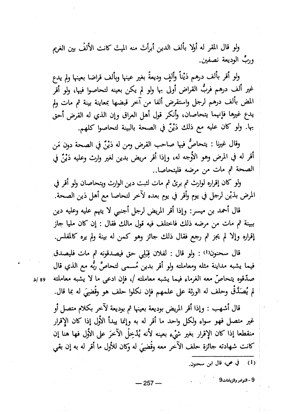 ولو قال المقر لة أولا بألف الدين أبرأت منة الميت كانت الألف بين الغريم ورب الوديعة نصفين. ولو أقر بألف درهم دينا وألف وديعة بغير عينها وبألف قراضا بعينها ولم يدع غير ألف درهم فرب القراض أولى بها ولو لم يكن بعينة لتحاصوا فيها، ولو أقر المض بألف درهم لرجل واستقرض ألفا من آخر قبضها بمعاينة بينة ثم مات ولم يدع غيرها فإنهما يتحاصان، وأنكر قول أهل العراق وإن الذى لة القرض أحق بها. ولو كان علية مع ذلك دين فى الصحة بالبينة لتحاصوا كلهم. وقال غيرنا: يتحاص فيها صاحب القرض ومن لة دين فى الصحة دون من أقر لة فى المرض وهو الأوجة لة، وإذا أقر مريض بدين لغير وارث وعلية دين فى الصحة ثم مات من مرضة فليتحاصا .. ولو كان إقرارة لوارث ثم برىء ثم مات لثبت دين الوارث ويتحاصان ولو أقر فى المرض بدين لرجل فى يوم وأقر فى يوم بعدة لآخر لتحاصا مع أهل دين الصحة. قال أحمد بن ميسر: وإذا أقر المريض لرجل أجنبى لا يتهم علية وعلية دين ببينة ثم مات من مرضة ذلك فاختلف فية قول مالك فقال: إن كان مليا جاز إقرارة وإلا لم يجز ثم رجع فقال ذلك جائز وهو كمن لة بينة ولم يرة كالمفلس. قال سحنون (¬1): ولو قال: لفلان قبلى حق فيصدقونة ثم مات فليصدق فيما يشبة مداينة مثلة ومعاملتة ولو أقر بدين مسمى لتحاص ربة مع الذى قال صدقوة يتحاص معة الغرماء فيما يشبة معاملتة /، فإن ادعى ما لا يشبة معاملتة 89/ظ لم يصدق وحلف لة الورثة على علمهم فإن نكلوا حلف هو وقضى لة بما قال. قال أشهب: وإذا أقر المريض بوديعة بعينها ثم بوديعة لآخر بكلام متصل أو غير متصل فهو سواء ولكل واحد ما أقر لة بة وإنما يبدأ الأول إذا كان الإقرار منقطعا إذا كان الإقرار بغير شىء بعينة لأنة يدخل الآخر على الأول فها هنا إن كانت شهادتة جائزة حلف الآخر معة وقضى لة وكان للأول ما أقر لة بة إن بقى