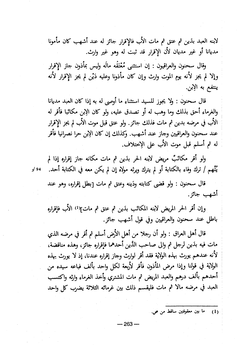 لابنة العبد بدين ثم عتق ثم مات الأب فالإقرار جائز لة عند أشهب كان مأمونا مديانا أو غير مديان لأن الإقرار قد ثبت لة وهو غير وارث. وقال سحنون والعراقيون: إن استثنى معتقة مالة بمأذون جاز الإقرار وإلا لم يجز لأنة يوم الموت وارث وإن كان مأذونا وعلية دين لم يجز الإقرار لأنة ينتفع بة الابن. قال سحنون: ولا يجوز للسيد استثناء ما أوصى لة بة إذا كان العبد مديانا والغرماء أحق بذلك وما وهب لة أو تصدق علية، ولو كان الابن مكائبا فأقر لة الأب فى مرضة بدين ثم مات فذلك جائز. ولو عتق قبل موت الأب لم يجز الإقرار لة ثم أسلم قبل موت الأب على الاختلاف. ولو أقر مكائب مريض لابنة الحر بدين ثم مات مكانة جاز إقرارة إذا لم يتهم / ترك وفاء بالكتابة أو لم يترك ويرثة مولاة إن لم يكن معة فى الكتابة أحد. 94/وقال سحنون: ولو قضى كتابتة ودينة وعتق ثم مات (بطل إقرارة، وهو عند أشهب جائز. وإن أقر الحر المريض لابنة المكائب بدين ثم عت ثم مات) (¬1) الأب فإقرارة باطل عند سحنون والعراقيين وفى قول أشهب جائز. قال أهل العراق: ولو أن رجلا من أهل الأرض أسلم ثم أقر فى مرضة الذى مات فية بدين لرجل ثم والى صاحب الدين أحدهما فإقرارة جائز، وهذة مناقضة، لأنة عندهم يورث بهذة الولاية فقد أقر لوارث وجاز إقرارة عندنا، إذ لا يورث بهذة الولاية فى قولنا وإذا مرض المأذون فأقر لأربعة لكل واحد بألف فباعة سيدة من أحدهم بألف درهم والعبد المريض ثم مات المشترى وأخذ الغرماء وارثة واكتسب العبد فى مرضة مالا ثم مات فليقسم ذلك بين غرمائة الثلاثة يضرب كل واحد