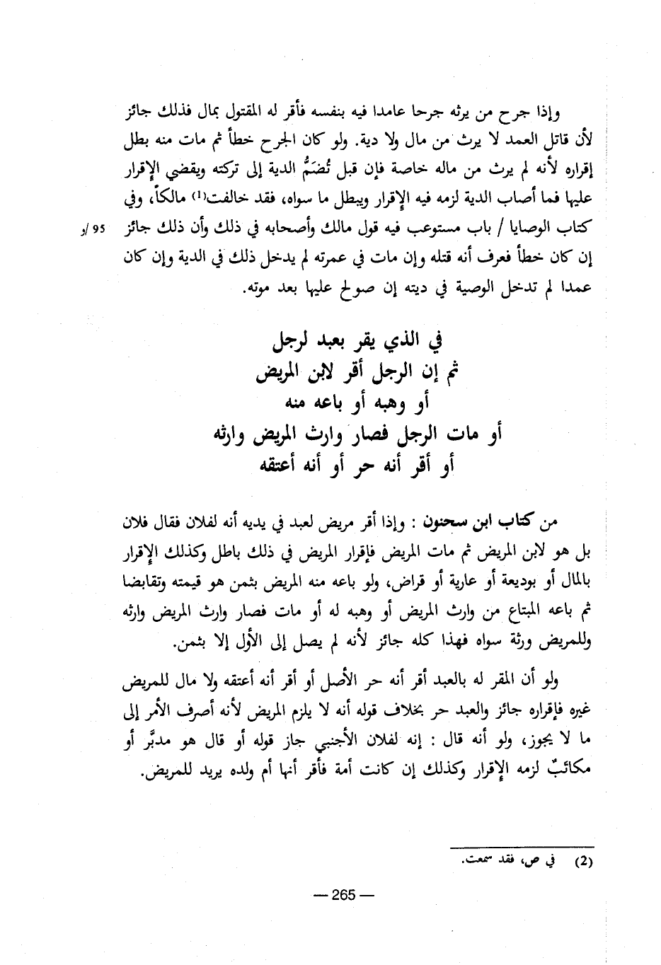 وإذا جرح من يرثة جرحا عامدا فية بنفسة فأقر لة المقتول بمال فذلك جائز لأن قاتل العمد لا يرث من مال ولا دية. ولو كان الجرح خطأ ثم مات منة بطل إقرارة لأنة لم يرث من مالة خاصة فإن تضم الدية إلى تركتة ويقضى الإقرار عليها فما أصاب الدية لزمة فية الإقرار ويبطل ما سواة، فقد خالفت (¬1) مالكا، وفى كتاب الوصايا / باب مستوعب فية قول مالك وأصحابة فى ذلك وأن ذلك جائز 95/وإن كان خطأ فعرف أنة قتلة وإن كان عمدا لم تدخل الوصية فى ديتة إن صولح عليها بعد موتة. فى الذى يقر بعبد لرجل ثم إن الرجل أقر لابن المريض أو وهبة أو باعة منة أو مات الرجل فصار وارث المريض وارثة أو أقر أنة حر أو أنة أعتقة من كتاب ابن سحنون: وإذا أقر مريض لعبد فى يدية أنة لفلان فقال فلان بل هو لابن المريض ثم مات المريض فإقرار المريض فى ذلك باطل وكذلك الإقرار بالمال أو بوديعة أو عارية أو قراض، ولو باعة منة المريض بثمن هو قيمتة وتقابضا ثم باعة المبتاع من وارث المريض أو وهبة لة أو مات فصار وارث المريض وارثة وللمريض ورثة سواة فهذا كلة جائز لأنة لم يصل إلى الأول إلا بثمن. ولو أن المقر لة بالعبد أقر أنة حر الأصل أو أقر أنة أعتقة ولا مال للمريض غيرة فإقرارة جائز والعبد حر بخلاف قولة أنة لا يلزم المريض لأنة أصرف الأمر إلى ما لا يجوز، ولو أنة قال: إنة لفلان الأجنبى جاز قولة أو قال هو مدبر أو مكاتب لزمة الإقرار وكذلك إن كانت أمة فأقر أنها أم ولدة يريد للمريض.