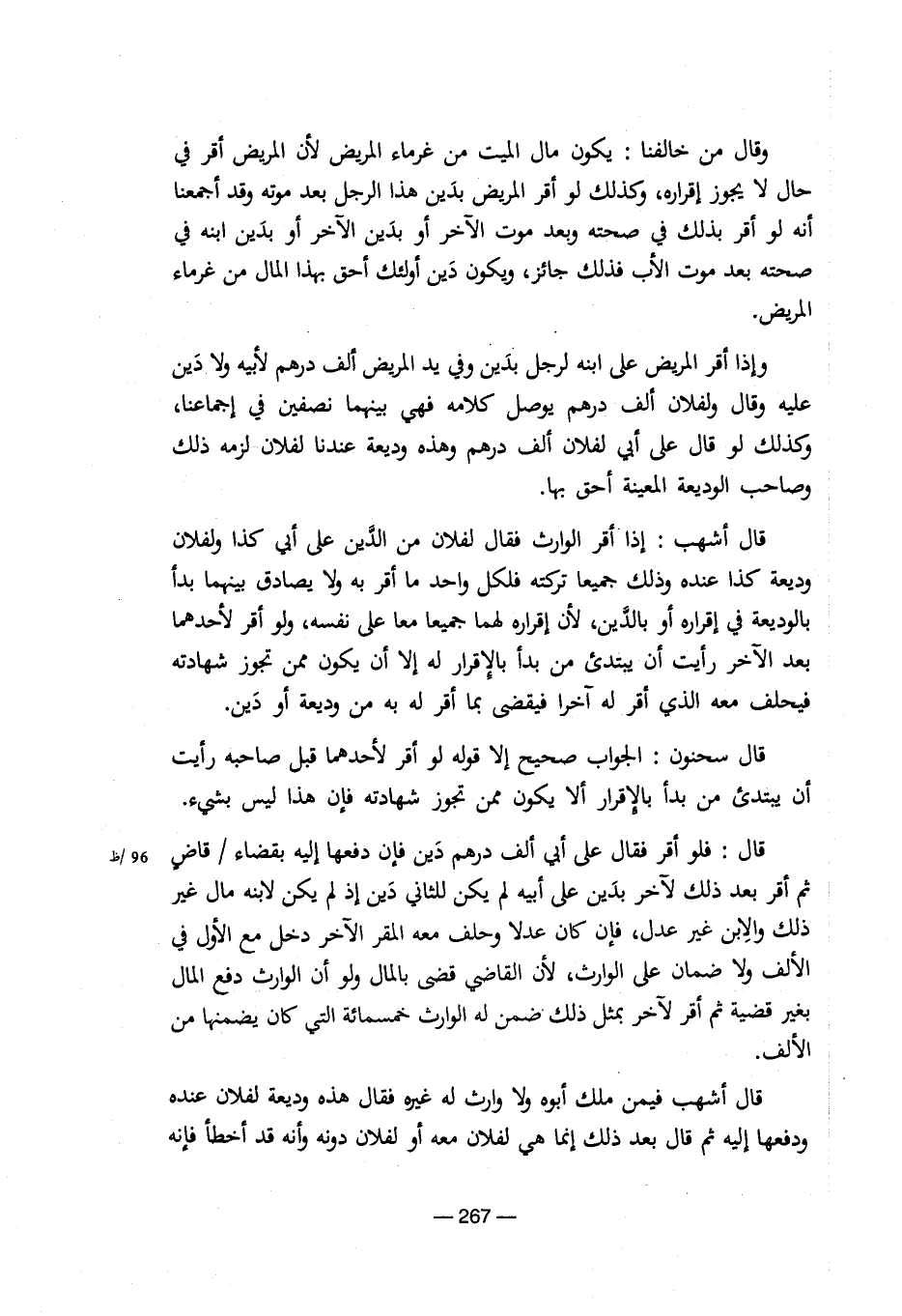 وقال من خالفنا: يكون مال الميت من غرماء المريض لأن المريض أقر فى حال لا يجوز إقرارة، وكذلك لو أقر المريض بدين هذا الرجل بعد موتة وقد أجمعنا أنة لو أقر بذلك فى صحتة وبعد موت الآخر أو بدين الآخر أو بدين ابنة فى صحتة بعد موت الأب فذلك جائز، ويكون دين أولئك أحق بهذا المال من غرماء المريض. وإذا أقر المريض على ابنة لرجل بدين وفى يد المريض ألف درهم لأبية ولا دين علية وقال ولفلان ألف درهم يوصل كلامة فهى بينهما نصفين فى إجماعنا، وكذلك لو قال على أبى لفلان ألف درهم وهذة وديعة عندنا لفلان لزمة ذلك وصاحب الوديعة المعينة أحق بها. قال أشهب: إذا أقر الوارث فقال لفلان من الدين على أبى كذا ولفلان وديعة كذا عندة وذلك جميعا تركتة فلكل واحد ما أقر بة ولا يصادق بينهما بدا بالوديعة فى إقرارة أو بالدين، لأن إقرارة لهما جميعا معا على نفسة، ولو أقر لأحدهما بعد الآخر رأيت أن يبتدىء من بدأ بالإقرار لة إلا أن يكون ممن تجوز شهادتة فيحلف معة الذى أقر لة آخرا فيقضى بما أقر لة بة من وديعة أو دين. قال سحنون: الجواب صحيح إلا قولة لو أقر لأحدهما قبل صاحبة رأيت أن يبتدىء من بدأ الإقرار ألا يكون ممن تجوز شهادتة فإن هذا ليس بشىء. قال: فلو أقر فقال على أبى ألف درهم دين فإن دفعها إلية بقضاء / قاض 96/ظ ثم أقر بعد ذلك لآخر بدين على أبية لم يكن للثانى دين إذ لم يكن لابنة مال غير ذلك والابن غير عدل، فإن كان عدلا وحلف معة المقر الآخر دخل مع الأول فى الألف ولا ضمان على الوارث، لأن القاضى قضى بالمال ولو أن الوارث دفع المال بغير قضية ثم أقر لآخر بمثل ذلك ضمن لة الوارث خمسمائة التى كان يضمنها من الألف. قال أشهب فيمن ملك أبوة ولا وارث لة غيرة فقال هذة وديعة لفلان عندة ودفعها إلية ثم قال بعد ذلك إنما هى لفلان معة أو لفلان دونة وأنة قد أخطأ فإنة