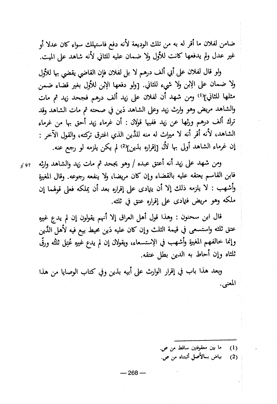 (ولو دفعها الابن للأول بغير قضاء ضمن مثلها للثانى) (¬1) ومن شهد أن لفلان على زيد ألف درهم فجحد زيد ثم مات والشاهد مريض وهو وارث زيد وعلى الشاهد دين فى صحتة ثم مات الشاهد وقد ترك ألف درهم ورثها عن زيد ففيها قولان: أن غرماء زيد أحق بها من غرماء الشاهد، لأنة أقر أنة لا ميراث لة منة للدين الذى اغترق تركتة، والقول الآخر: إن غرماء الشاهد أولى بها لأن (إقرارة بدين) (¬2) لم يكن يلزمة لو رجع عنة. ومن شهد على زيد أنة أعتق عبدة / وهو يجحد ثم مات زيد والشاهد وارثة 97/وفابن القاسم يعتقة بالقضاء وإن كان مريضا، ولا ينفعة رجوعة. وقال المغيرة وأشهب: لا يلزمة ذلك إلا أن يتمادى على إقرارة بعد أن يملكة فعلى قولهما إن ملكة وهو مريض فتمادى على إقرارة عتق فى ثلثة. قال ابن سحنون: وهذا قول أهل العراق إلا أنهم يقولون إن لم يدع غيرة عتق ثلثة واستسعى فى قيمة الثلث وإن كان علية دين محيط بيع فية لأهل الدين وإنما خالفهم المغيرة وأشهب فى الاستسعاء، ويقولان إن لم يدع غيرة عتق ثلثة ورق ثلثاة وإن أحاط بة الدين بطل عتقة. وبعد هذا باب فى إقرار الوارث على أبية بدين وفى كتاب الوصايا من هذا المعنى.