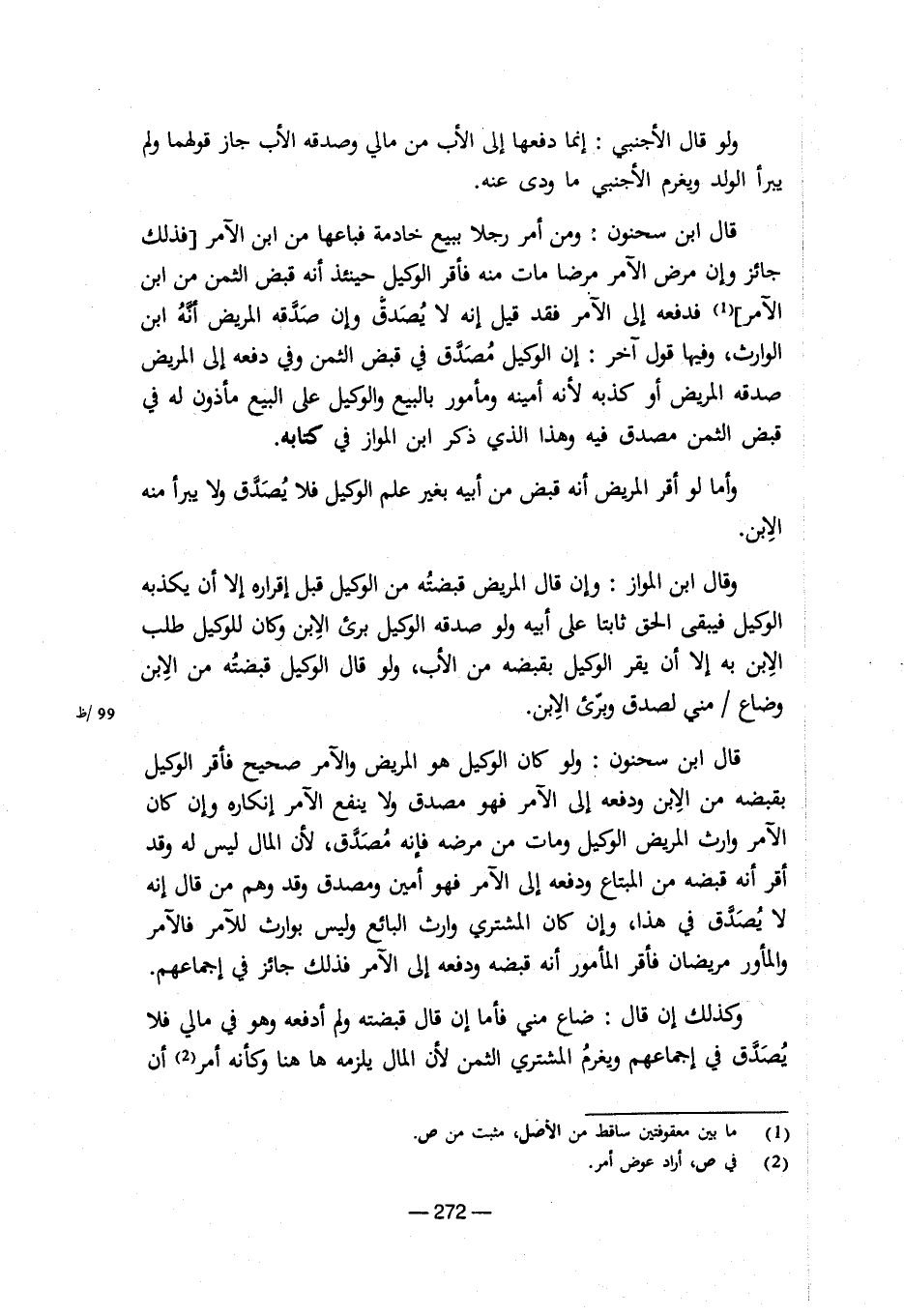 ولو قال الأجنبى: إنما دفعها إلى الأب من مالى وصدقة الأب جاز قولهما ولم يبرأ الولد ويغرم الأجنبى ما ودى عنة. قال ابن سحنون: ومن أمر رجلا ببيع خادنة فباعها من ابن الآمر (فذلك جائز وإن مرض الآمر مرضا مات منة فأقر الوكيل حينئذ أنة قبض الثمن من ابن الآمر) (¬1) فدفعة إلى الآمر فقد قيل إنة لا يصدق وإن صدقة المريض أنة ابن الوارث، وفيها قول آخر: إن الوكيل مصدق فى قبض الثمن وفى دفعة إلى المريض صدقة المريض أو كذبة لأنة أمينة ومأمور بالبيع والوكيل على البيع مأذون لة فى قبض الثمن مصدق فية وهذا الذى ذكر ابن المواز فى كتابة. وأما لو أقر المريض أنة قبض من أبية بغير علم الوكيل فلا يصدق ولا يبرأ منة الابن. وقال ابن المواز: وإن قال المريض قبضتة من الوكيل قبل إقرارة إلا أن يكذبة الوكيل فيبقى الحق ثابتا على أبية ولو صدقة الوكيل برىء الابن وكان للوكيل طلب الابن بة إلا أن يقر الوكيل بقبضة من الأب، ولو قال الوكيل قبضتة من الابن وضاع / منى لصدق وبرىء الابن. 99/ظ قال ابن سحنون: ولو كان الوكيل هو المريض والآمر صحيح فأقر الوكيل بقبضة من الابن ودفعة إلى الآمر فهو مصدق ولا ينفع الآمر إنكارة وإن كان الآمر وارث المريض الوكيل ومات من مرضة فإنة مصدق، لأن المال ليس لة وقد أقر أنة قبضة من المبتاع ودفعة إلى الآمر فهو أمين ومصدق وقد وهم من قال إنة لا يصدق فى هذا، وإن كان المشترى وارث البائع وليس بوارث للآمر فالآمر والمأمور مريضان فأقر المأمور أنة قبضة ودفعة إلى الآمر فذلك جائز فى إجماعهم. وكذلك إن قال: ضاع منى فأما إن قال قبضتة ولم أدفعو وهو فى مالى فلا يصدق فى إجماعهم ويغرم المشترى الثمن لأن المال يلزمة ها هنا وكأنة أمر (¬2) أن