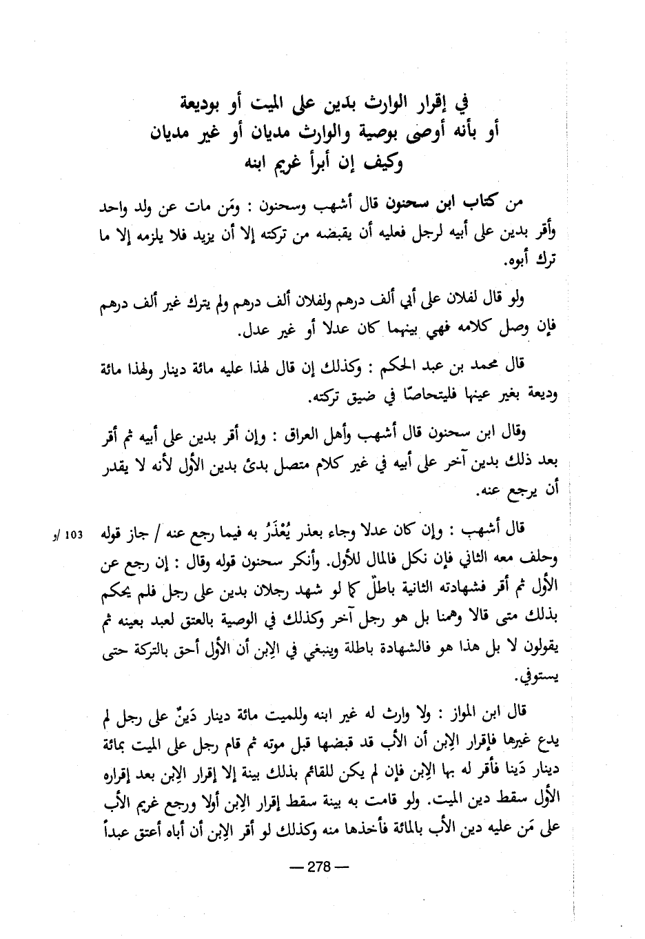 فى إقرار الوارث بدين على الميت أو بوديعة أو بأنة أوصى بوصية والوارث مديان أو غير مديان وكيف إن أبرأ غريم ابنة من كتاب ابن سحنون قال أشهب وسحنون: ومن مات عن ولد واحد وأقر بدين على أبية لرجل فعلية أن يقبضة من تركتة إلا أن يزيد فلا يلزمة إلا ما ترك أبوة. ولو قال لفلان على أبى ألف درهم ولفلان ألف درهم ولم يترك غير ألف درهم فإن وصل كلامة فهى بينهما كان عدلا أو غير عدل. قال محمد بن عبد الحكم: وكذلك إن قال لهذا علية مائة دينار ولهذا مائة وديعة بغير عينها فليتحاصا فى ضيق تركتة. وقال ابن سحنون قال أشهب وأهل العراق: وإن أقر بدين على أبية ثم أقر بعد ذلك بدين آخر على أبية فى غير كلام متصل بدىء بدين الأول لأنة لا يقدر أن يرجع عنة. قال أشهب: وإن كان عدلا وجاء بعذر بة فيما رجع عنة / جاز قولة 103/ووحلف معة الثانى فإن نكل فالمال للأول. وأنكر سحنون قولة وقال: إن رجع عن الأول ثم أقر فشهادته الثانية باطل كما لو شهد رجلان بدين على رجل فلم يحكم بذلك متى قالا وهمنا بل هو رجل آخر وكذلك في الوضية بالعتق لعبد بعينه ثم يقولون لا بل هذا هو فالشهادة باطلة وينبغى في الإبن أن الأول أحق بالتركة حتى يستوفي.