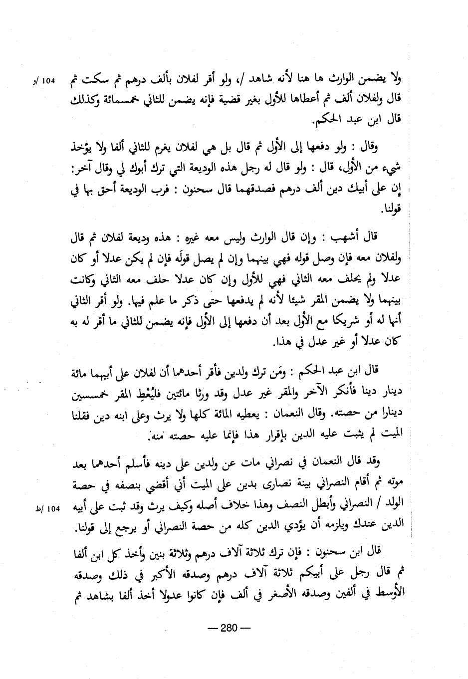 وقد قال النعمان في نصرانى مات عن ولدين على دينه فأسلم أحدهما بعد موته ثم أقام النصرانى بينه نصارى بدين على الميت أنى أقضي بنصفه في حصة الولد / النصرانى وأبطل النصف وهذا خلاف أصله وكيف يرث وقد ثبت على أبيه 104/ظ الدين عندك ويلزمه أن يؤدى الدين كله من حصة النصرانى أويرجع إلى قولنا.